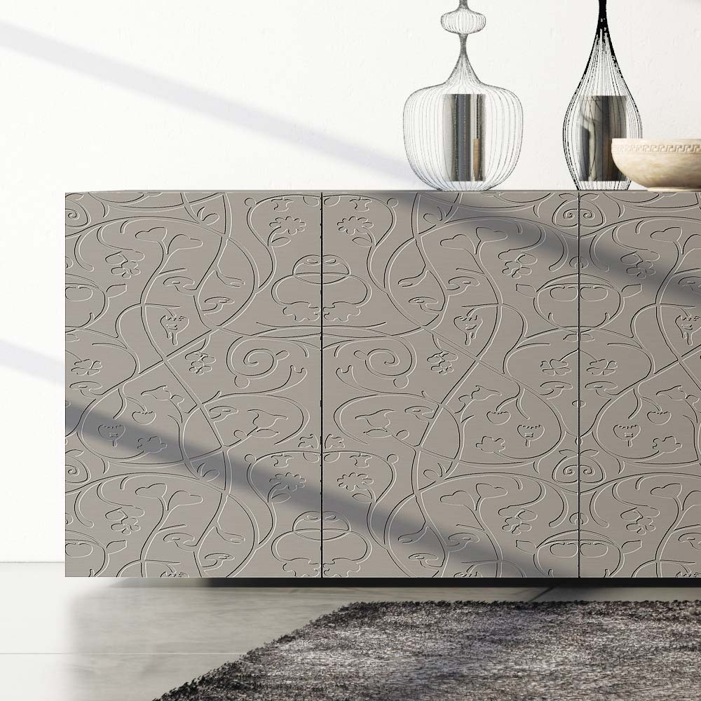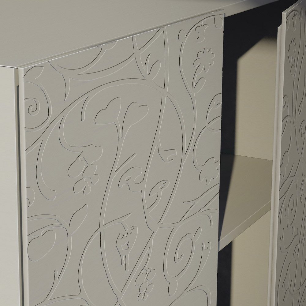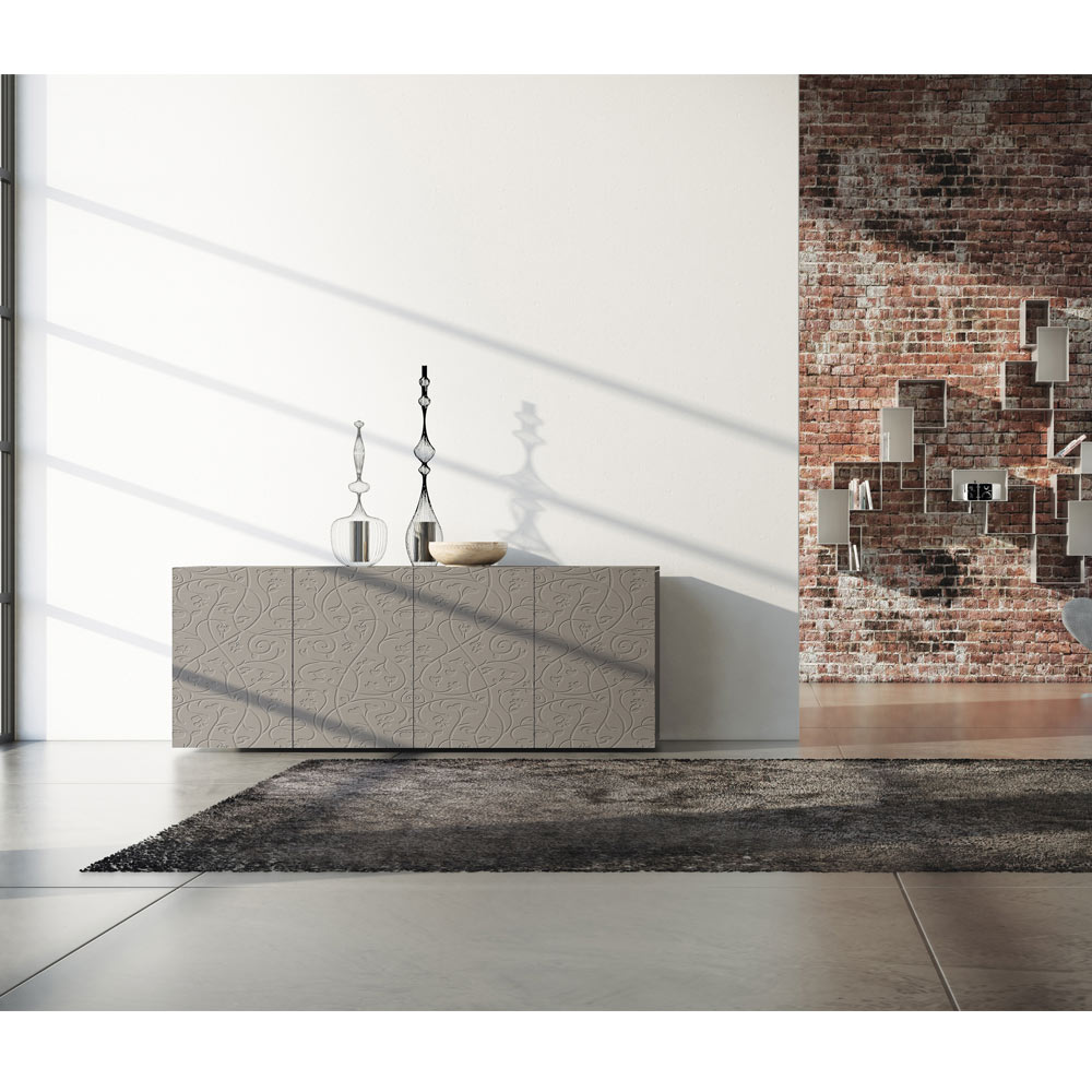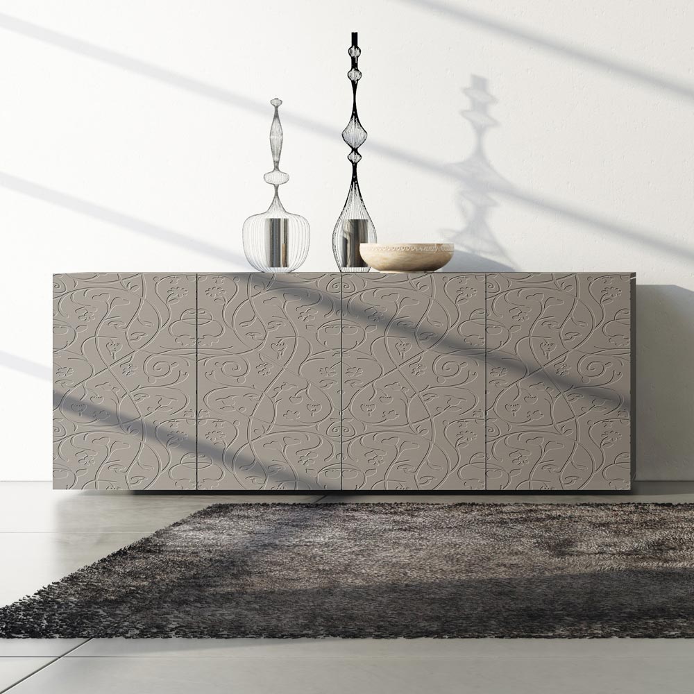 Living room sideboard with mud matt lacqueredMDF structure composed of 4 hinged doors which guarantee great functionality and practicality. This product is full of taste and design thanks to its elegant and refined finishes and the bas-relief decoration of the doors which makes them unique in their kind. The various materials used for the construction offer great quality and resistance over time, giving the product that unique and unforgettable touch.