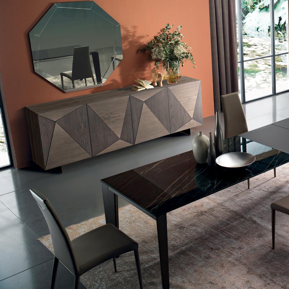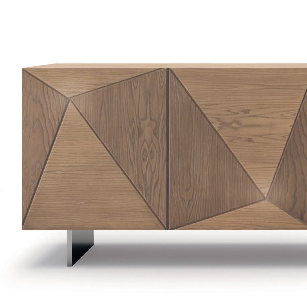 Living room sideboard made of ash veneer in knotted oak finish equipped with 3 or 4 handcrafted painted doors with push&pull opening system inside which we find transparenttempered glass shelves (6 mm thick, maximum load 20kg) and line feet. A furnishing accessory with an imposing and sophisticated style , ideal for those who love to enrich their environments in a way that is as functional as it is refined and cutting-edge. Its exclusive aesthetic is made unique by the particular workmanship that covers the expertly hand-painted doors which further increase the quality and value of the product. The 100% Made in Italy production and the use of high quality raw materials also give the sideboard solidity , resistance and excellent durability over time for an optimal result.