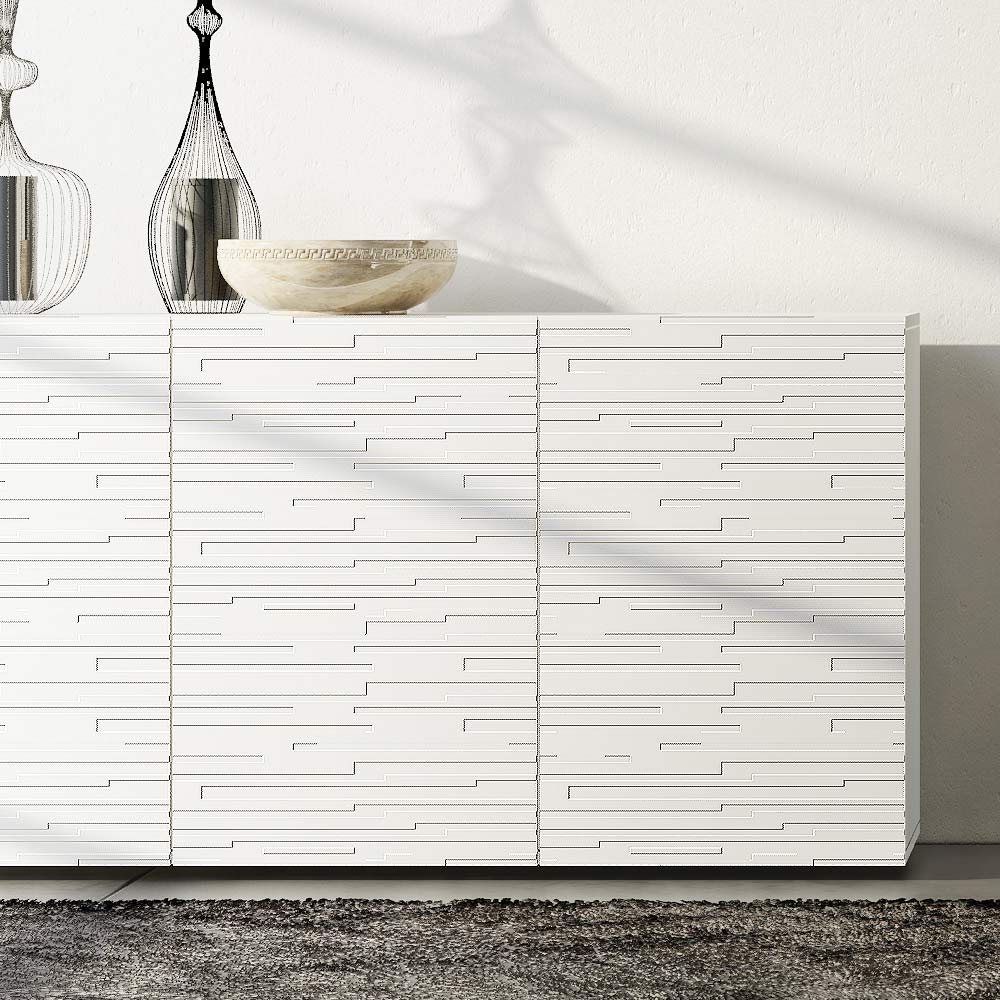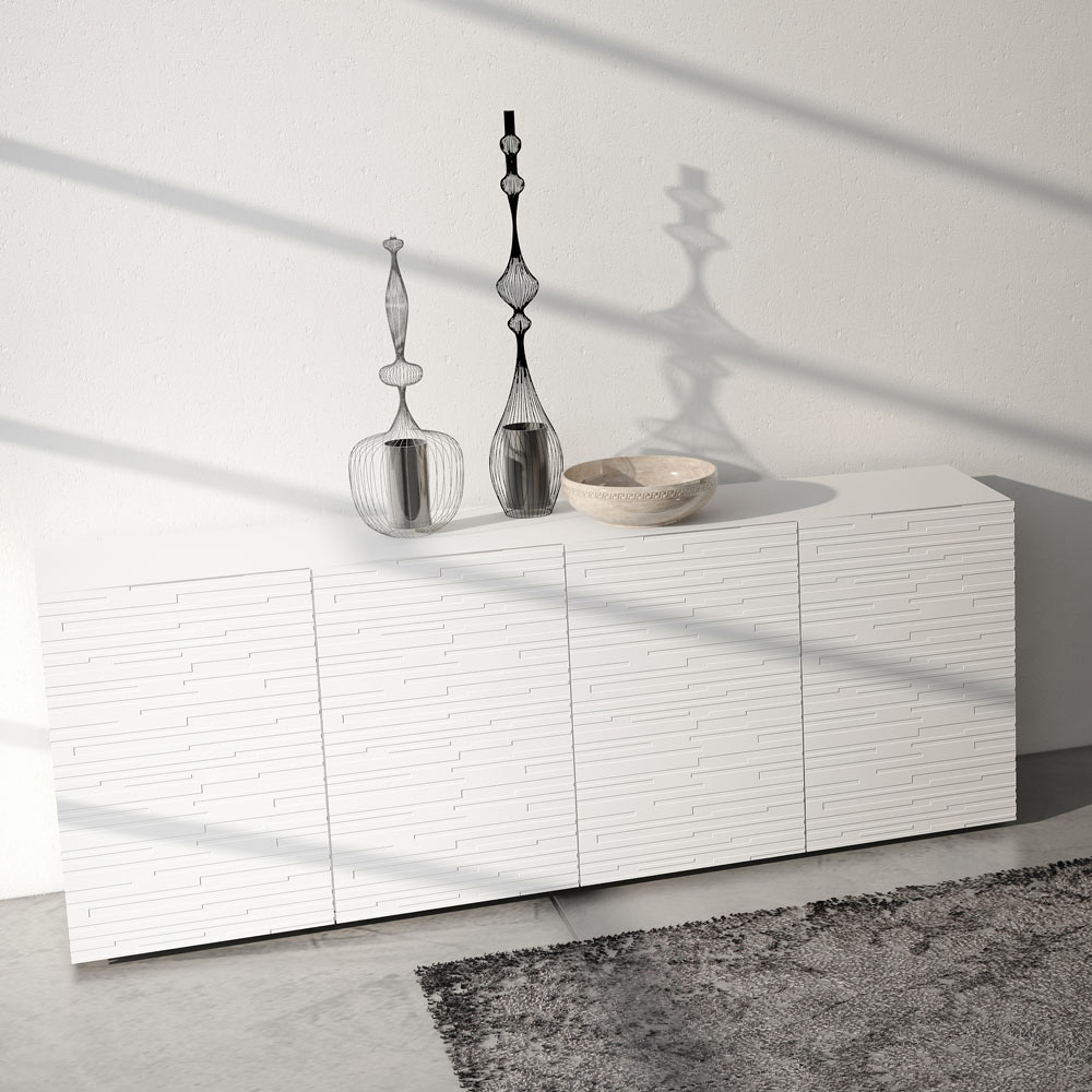Living room sideboard with matt lacqueredMDF structure and with opening system with 4 white matt lacquered hinged doors with bas-relief decoration. This product is characterized by functionality and design thanks to its elegant and refined finishes and the various materials used for its construction which offer great quality and resistance over time , giving the product that unique and unforgettable touch.
