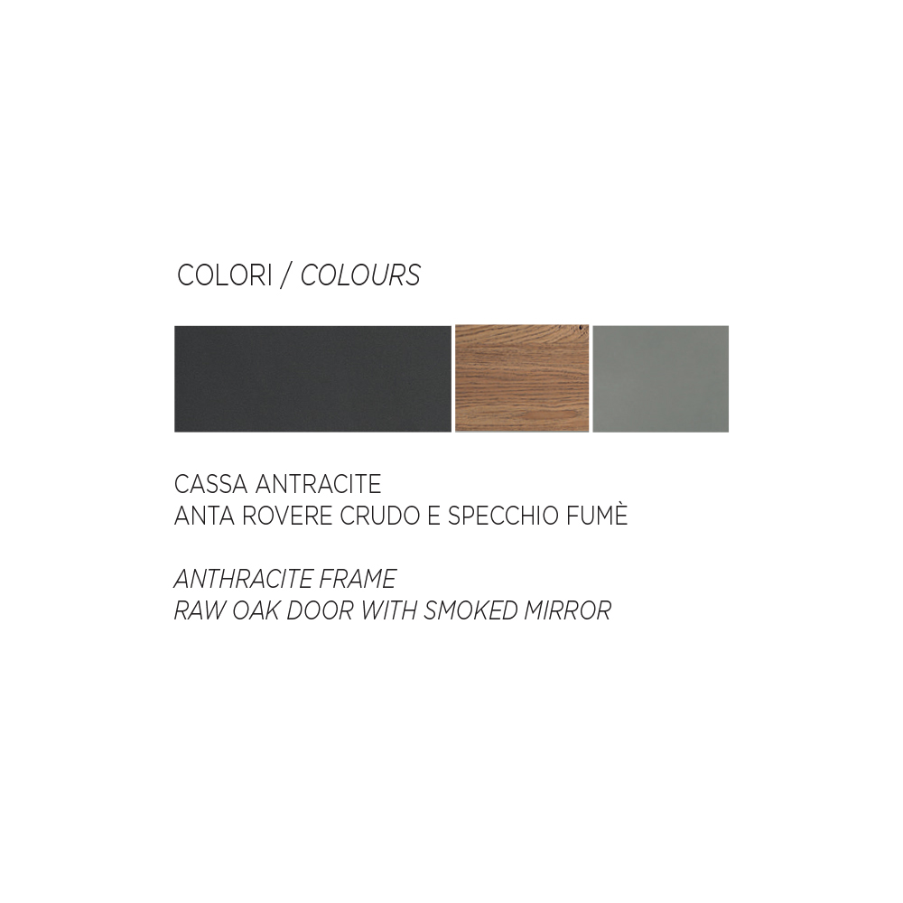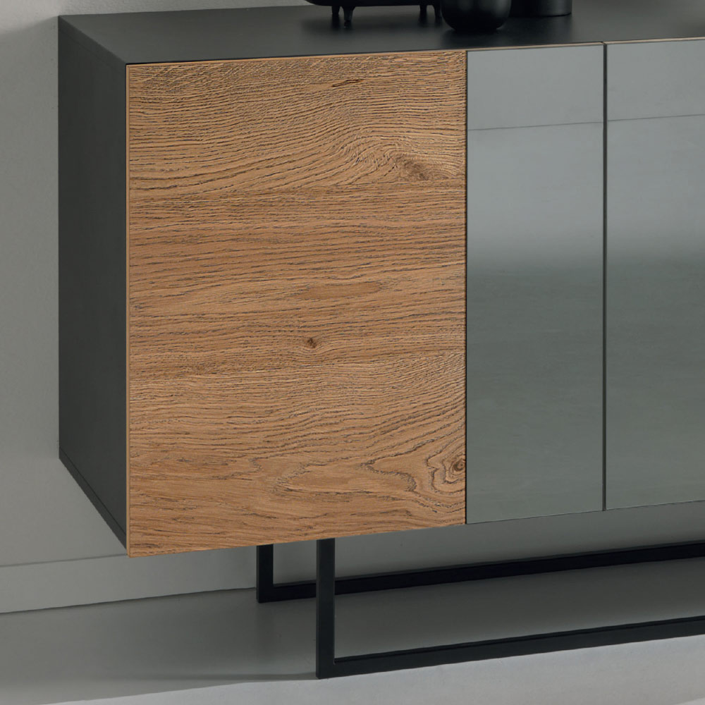 Modern sideboard with structure in anthracite finish melamine , 3 doors in veneered oak enriched by elegant inserts in smoked mirror and black painted metal feet. Made through a Made in Italy production process with fine raw materials , this wonderful decorative element for the living area offers optimal quality , excellent resistance and stability as well as a fascinating and avant-garde aesthetic , proving to be the perfect furnishing solution for those who looking for an elegant and functional piece of furniture at the same time.
