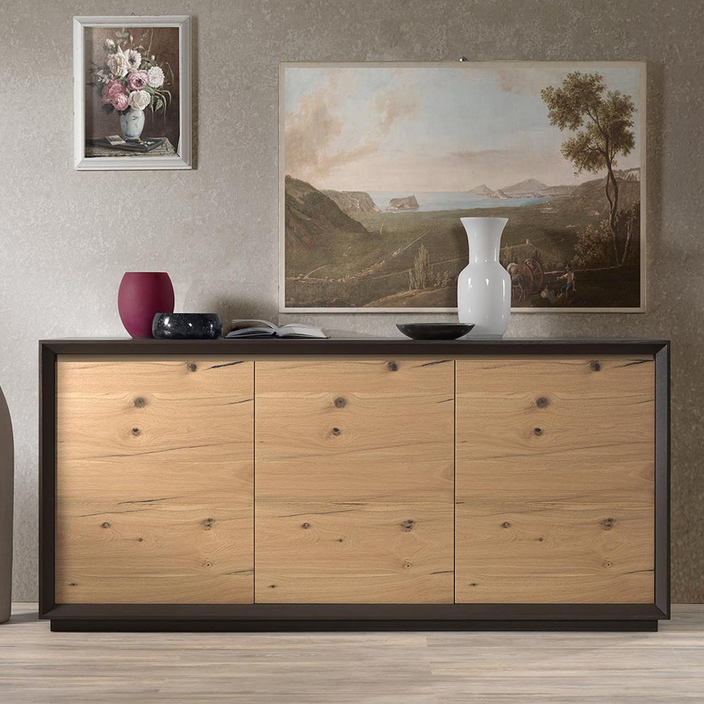 Sideboard with structure veneered on dark brown lacquered poplar chipboard and 3black stuccoed briccola doors with groove opening . Wooden base H 4cm. The modern style collection features unique, tailor-made pieces. Symbol of the innovation of those who know their craft and develop it fully with their hands, mind and heart. Furnishings are conceived as a means by which to achieve an ideal personal space.