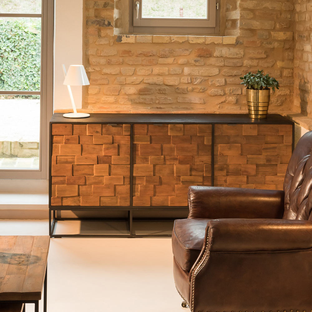 This furniture set è literally unique precisely because it encapsulates the peculiar history of the lived-in material. The workmanship is largely done according to handcrafted procedures. Every nick and imperfection, every scar on the wood, testifies to the originality of a past that is given new life. The recycled tropical wood legally from old artifacts, boats and abandoned buildings is expertly treated and brushed in order to regain dignity and luster. This product combines the’essence of rustic taste with the forms of contemporary design and with some details of the industrial style.