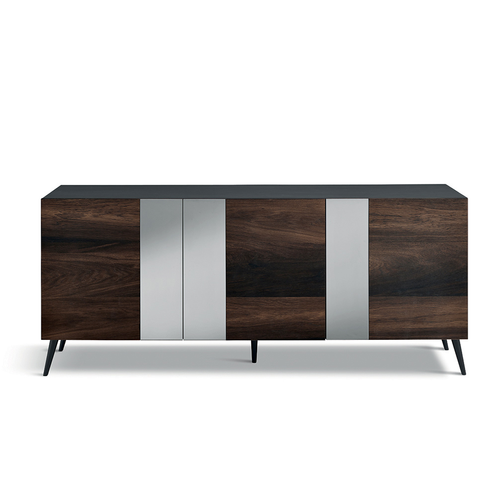 An elegant , Made in Italy designer sideboard , ideal for stylishly furnishing your living room or dining area . Its contemporary design stands out for its refined balance of natural materials and reflective surfaces, creating a furnishing accessory with a striking aesthetic impact.