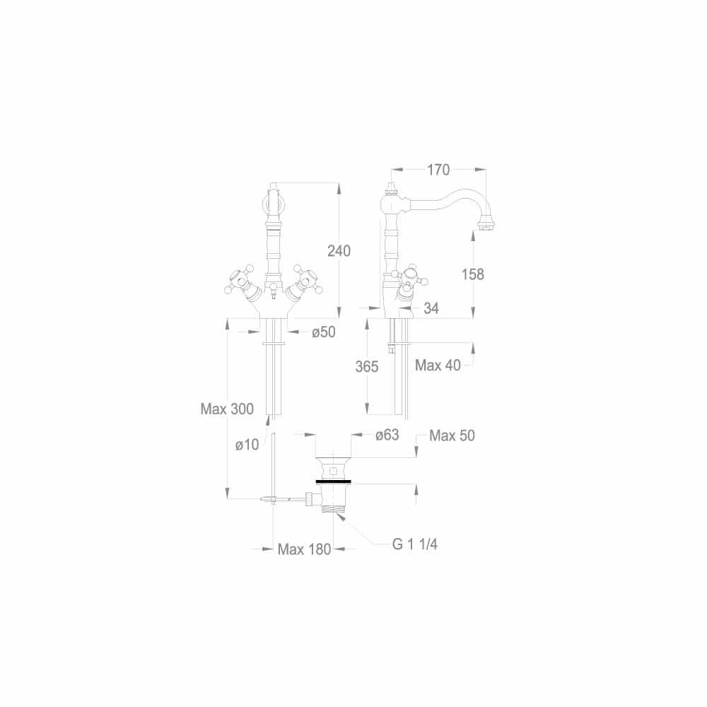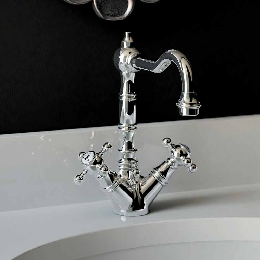 Classic design single-hole countertop washbasin mixer in chrome finish brass 240 mm high and with a 170 mm center distance with drain and pop-up lever. Entirely produced in Italy with high quality materials conforming to European standards. This mixer can be installed on the top, equipped with an aerator and 180 ° ceramic head; recommended for its Energy Saving system for water saving of 6L / min, for its swiveling spout and for its rigid connections.