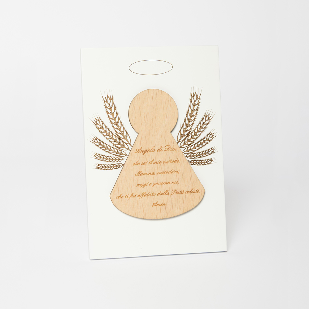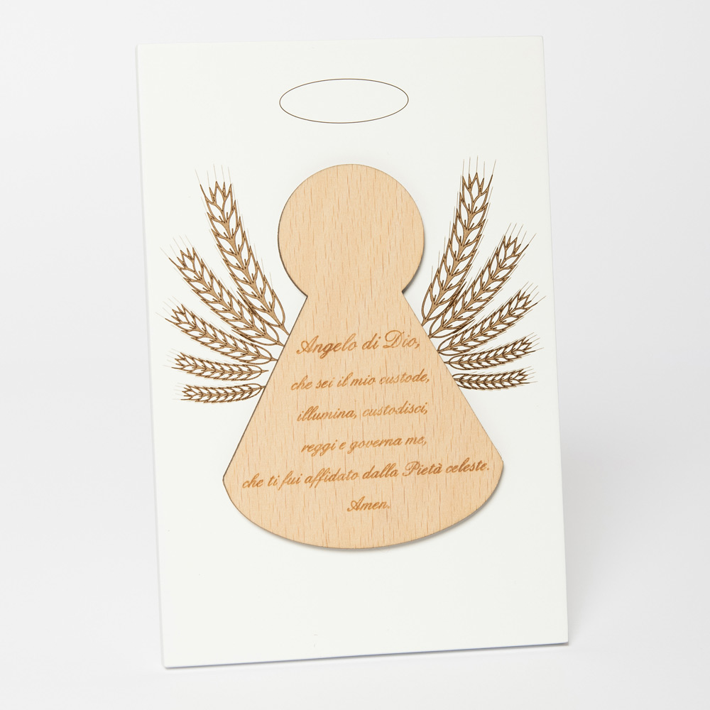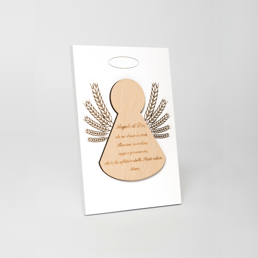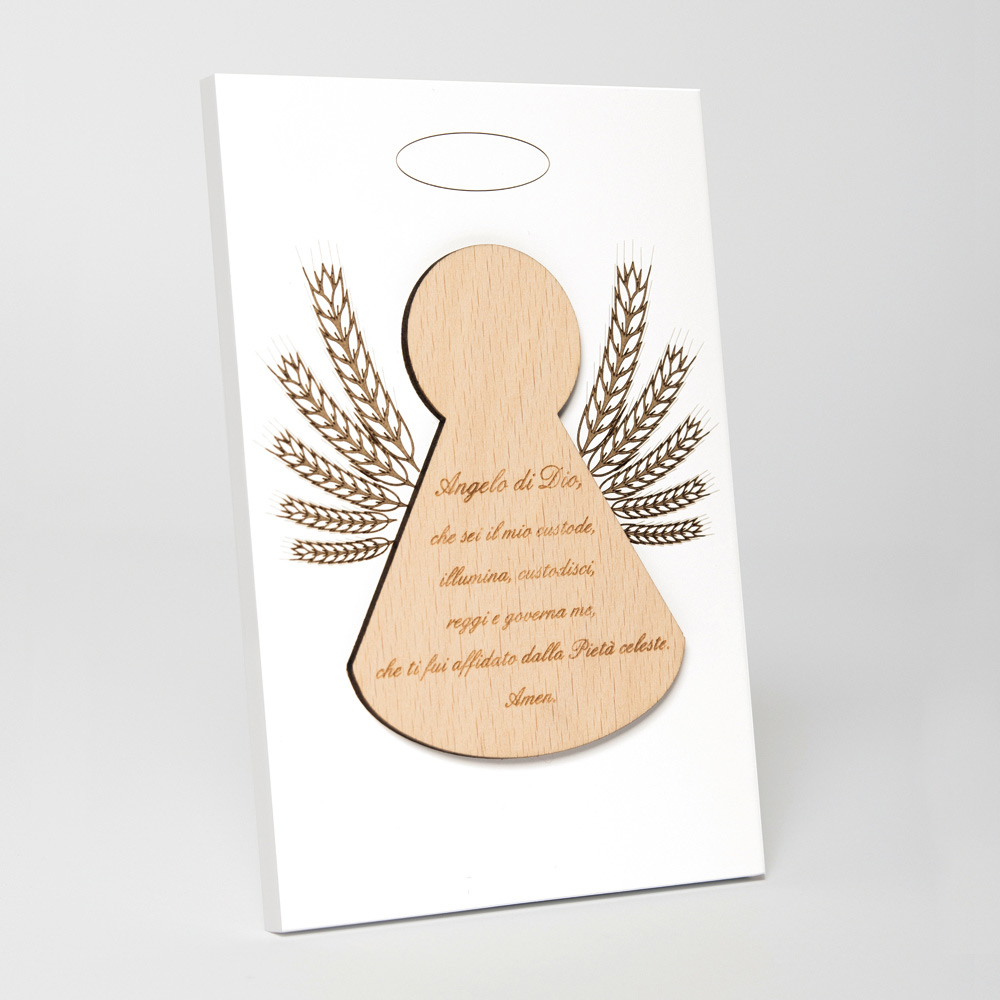 Sacred picture with application of an angel with engraved prayer. White lacquered wooden panel with support foot. Application in natural wood.