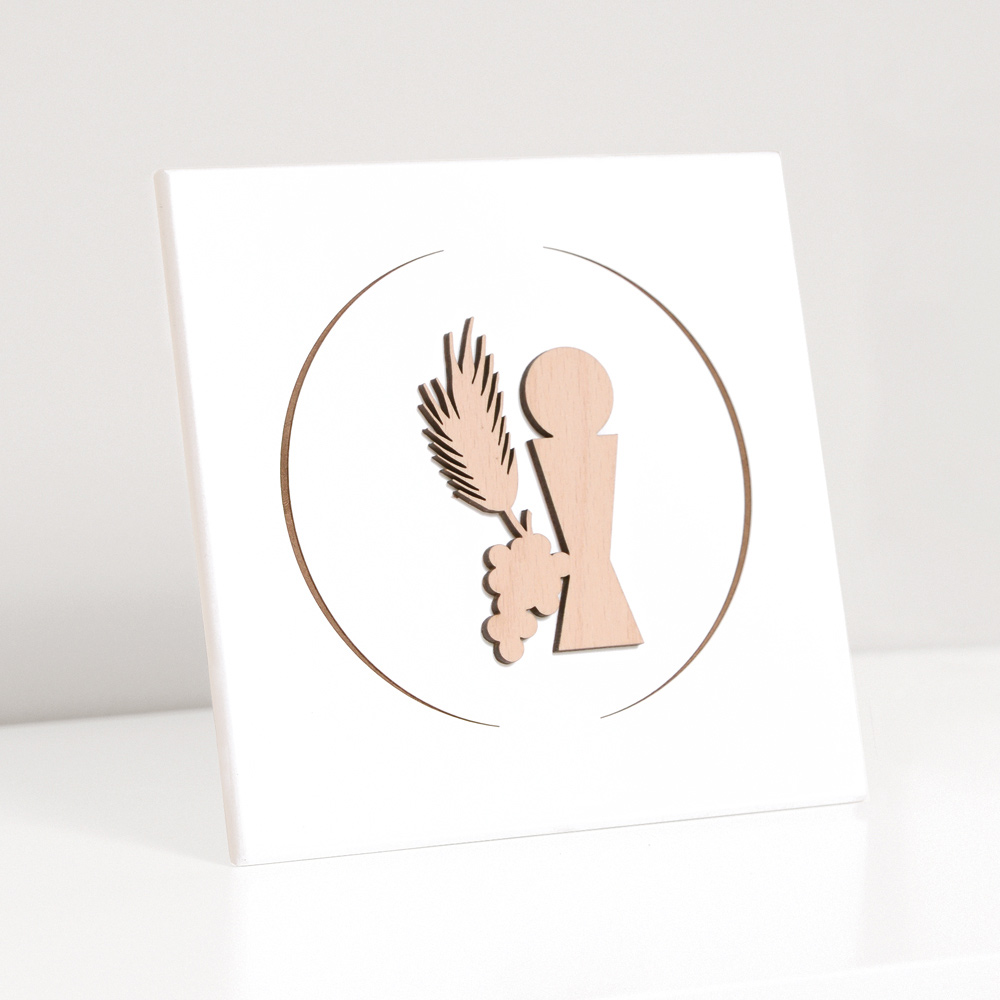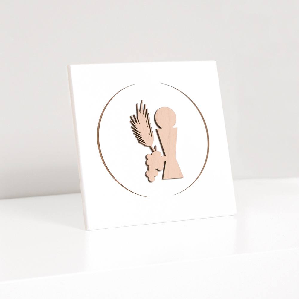 Sacred picture with communion chalice, ear and grapes in natural wood applied and laser engraved. White lacquered wooden panel with support foot and hole to hang it on the wall.