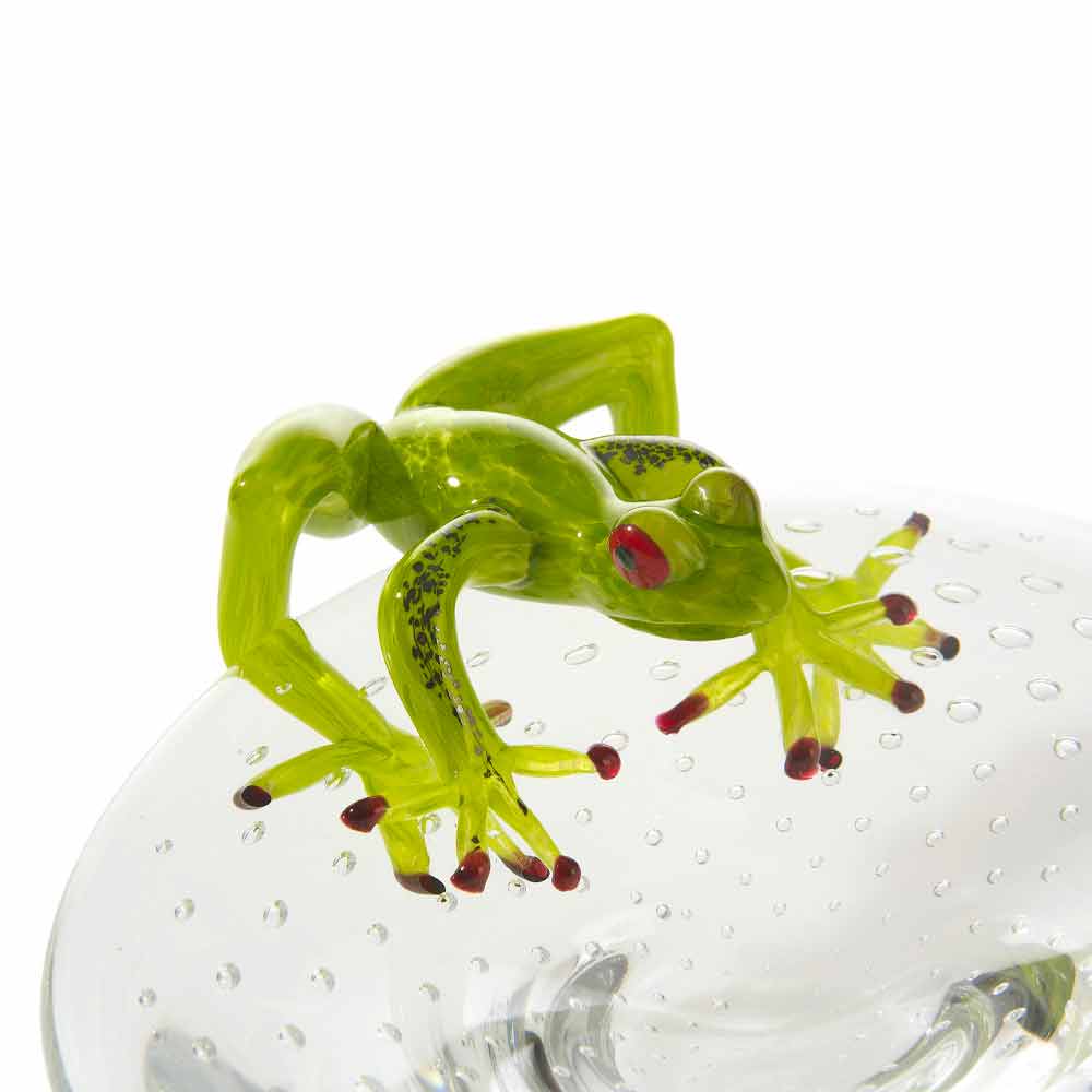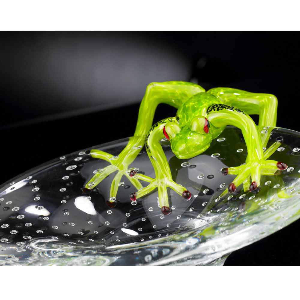 Tray-shaped ornament with frog entirely made in Italy in transparent and green glass . An eccentric and original design ideal for those who love to enrich their home spaces in a colorful and creative way for a unique furniture full of personality. Its shape and its aesthetics allow this complement to be positioned in the kitchen as an elegant centerpiece but also at the entrance as a practical valet tray or in any other area of the house as a simple decorative element capable of enriching the surrounding style with a touch of color thanks to its modern soul and the timeless elegance of glass.