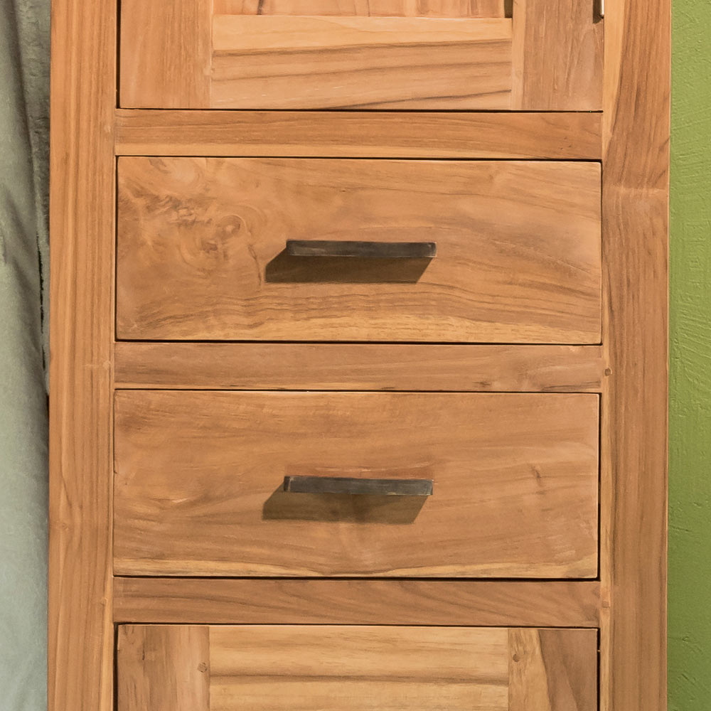 This solid teak bathroom cabinet is an elegant and functional solution, ideal for furnishing your bathroom with a natural, refined style. The slender structure and artisanal craftsmanship highlight the authentic grain of the wood , adding warmth and character to even the smallest spaces.