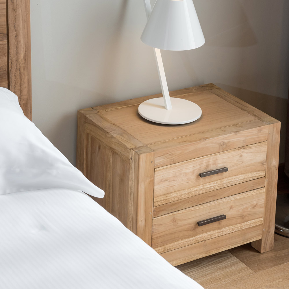 This solid teak bedside table is a compact and elegant piece of furniture, ideal for completing your bedroom with a natural, timeless style. The craftsmanship and natural wood grain give the piece a warm, authentic look.