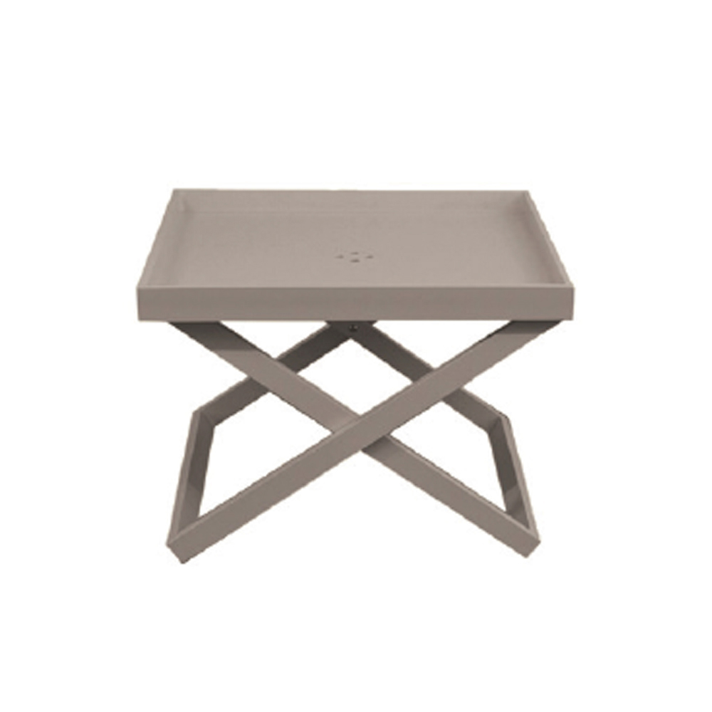 Square outdoor coffee table with removable tray and epoxy powder coated aluminum structure.