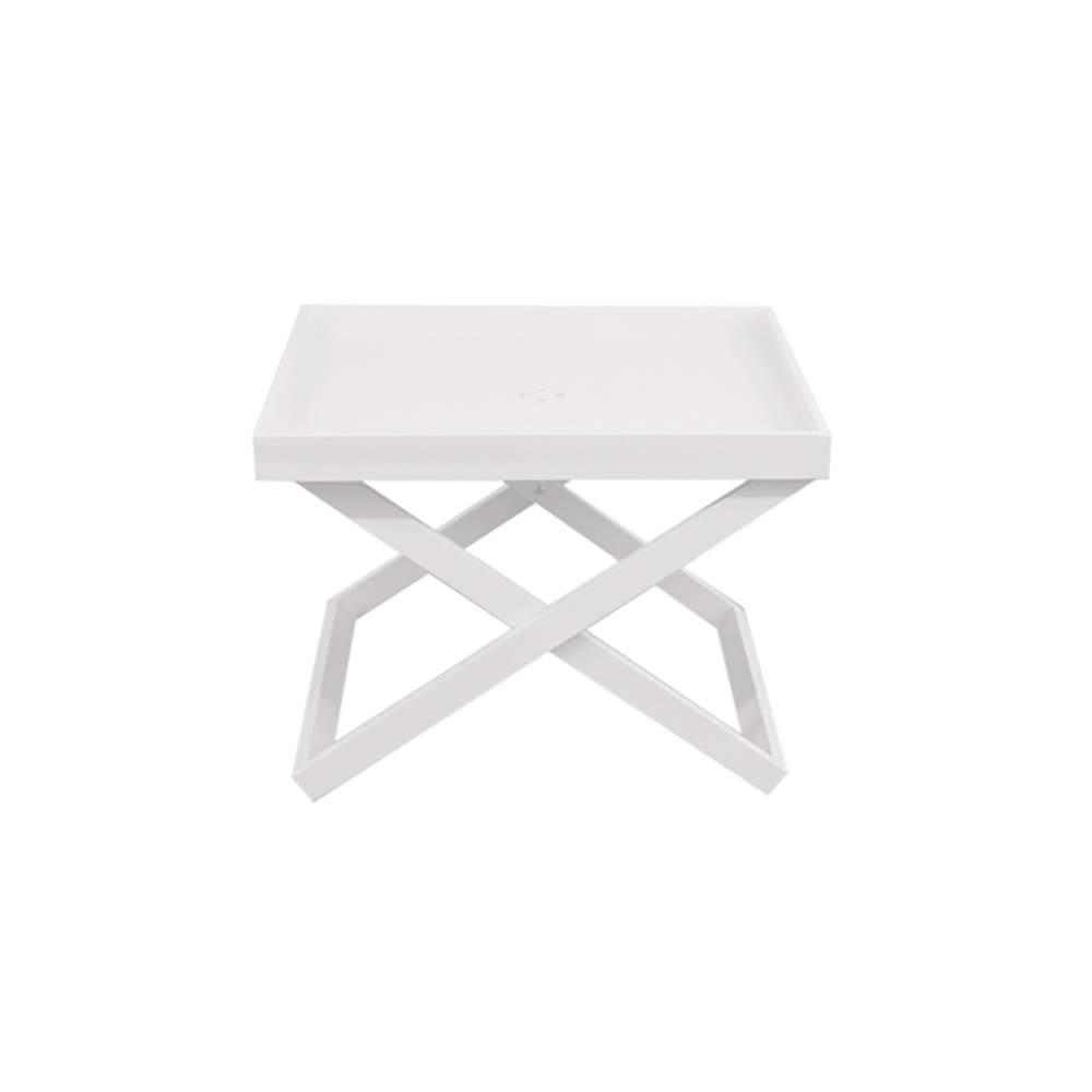 Square table for the garden made up of epoxy powder coatedaluminum top and structure with removable tray. Characterized by a soft, linear and simple design, this coffee table is perfect for decorating any outdoor environment such as terraces, swimming pools and gardens, while at the same time finding its place in the various indoor living areas as a functional support point.