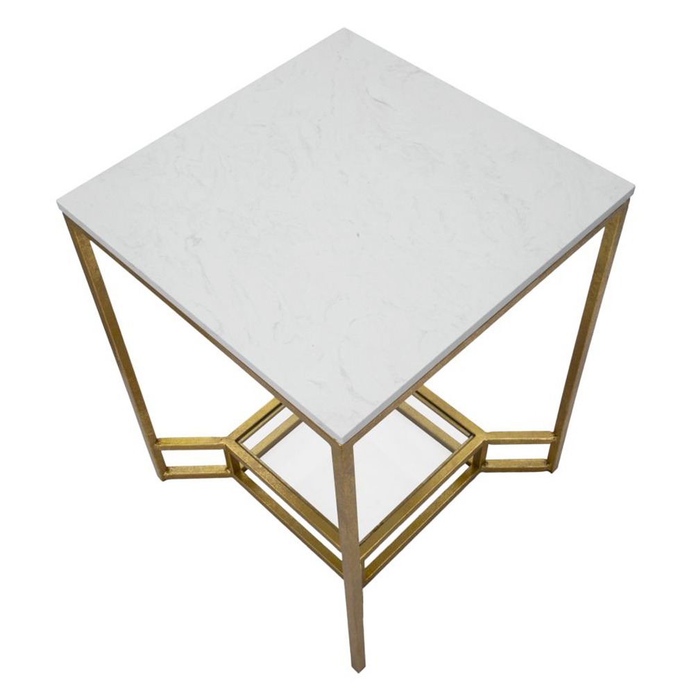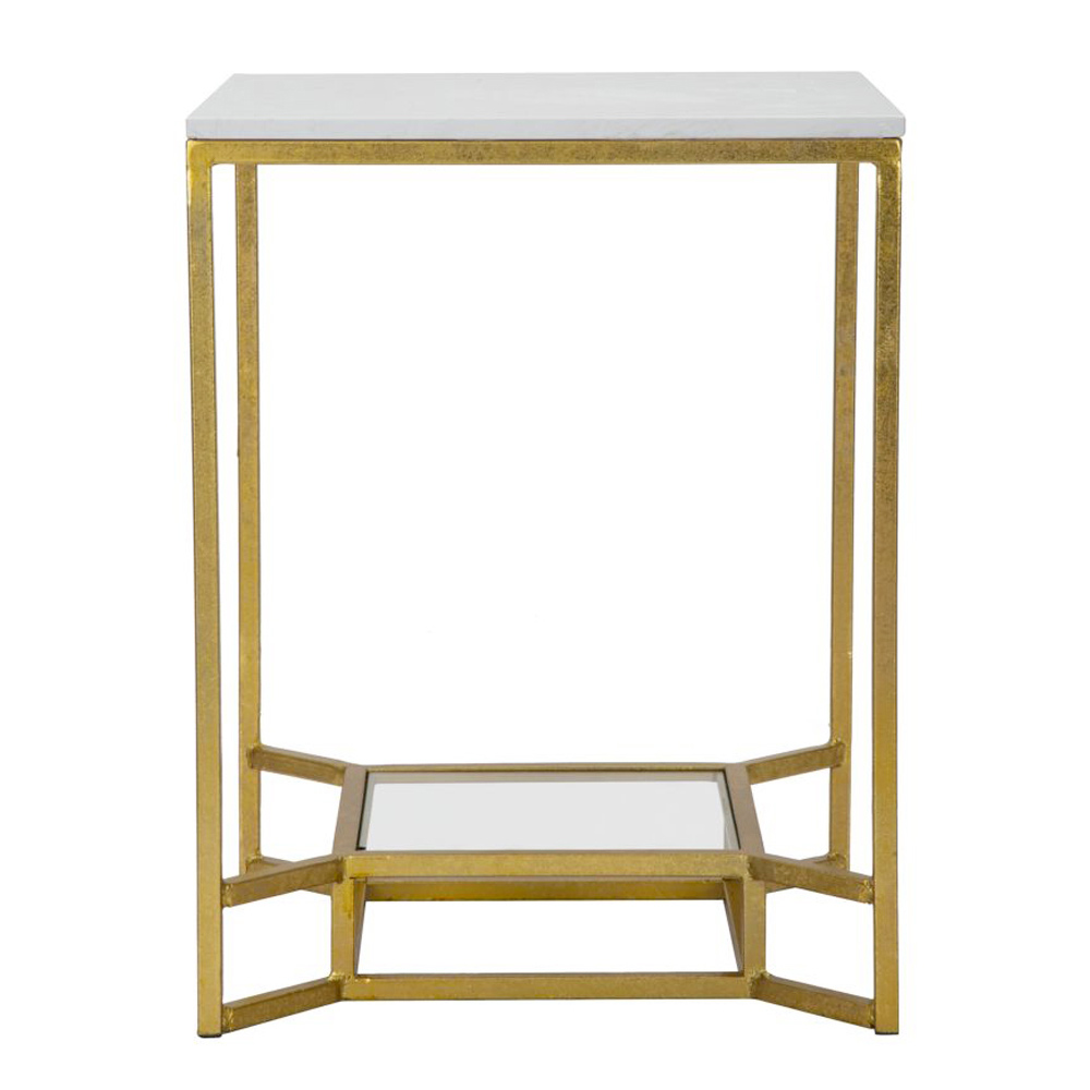 Coffee table with golden finish iron structure enriched by a glass insert and white marble effect resin top . A complement that combines elegance and functionality for an optimal result capable of acting as a practical support surface and at the same time as an original decorative element for the living area. Its design is punctuated by simple geometric lines that make it particularly versatile and therefore ideal for completing lounges with a refined style for an exclusive and refined furnishing with personality.