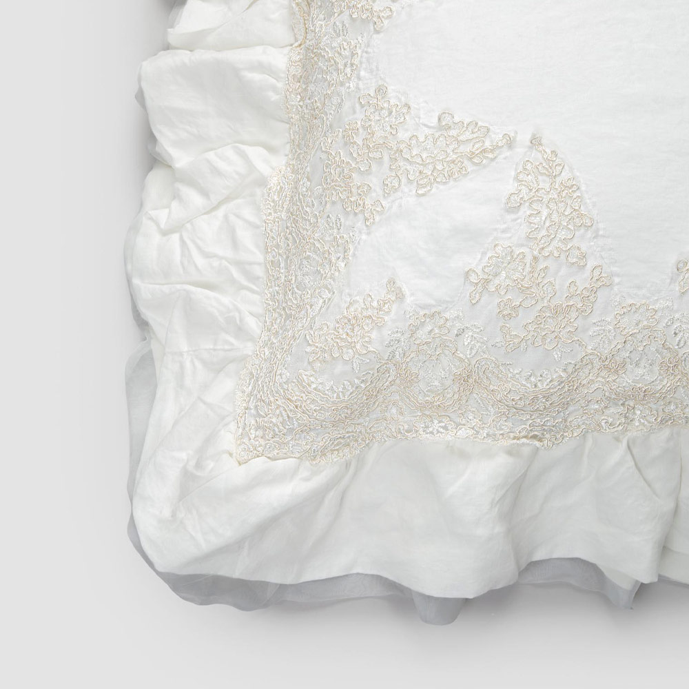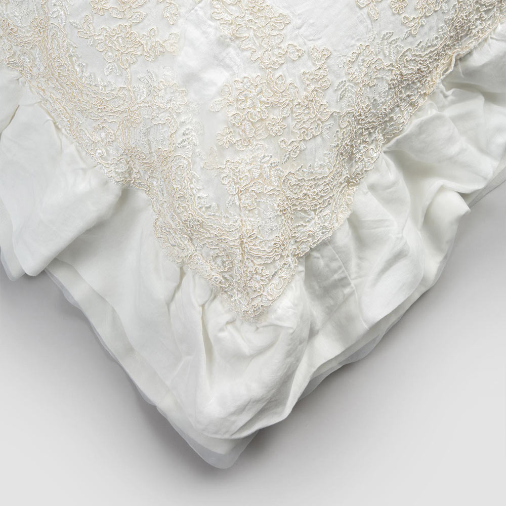 Decorative pillowcase in natural white linen with elegant lace and flounces, made in Italy quality.