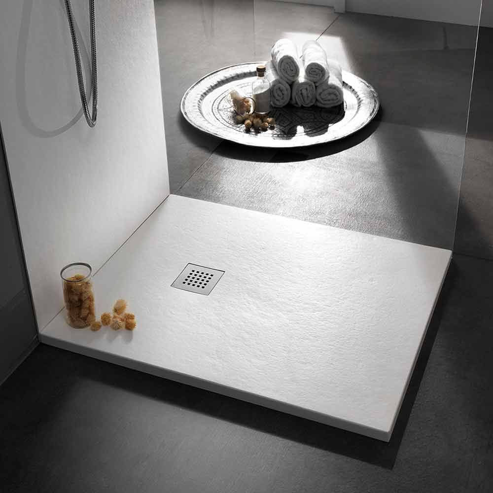 Modern shower tray made of resin and characterized with a particular stone effect finish . Complete with steel grate and drain. A simple style and essential lines characterize the entire design of the product allowing to focus attention on the particular texture capable of expressing solidity, bringing to mind the beauty and majesty of nature. Together with this fundamental feature of the product, its small-sized structure is conceived and designed to allow you to furnish even the smallest bathroom areas in a refined and classy way, where it will therefore not be necessary to renounce cutting-edge design as well as unmatched functionality.