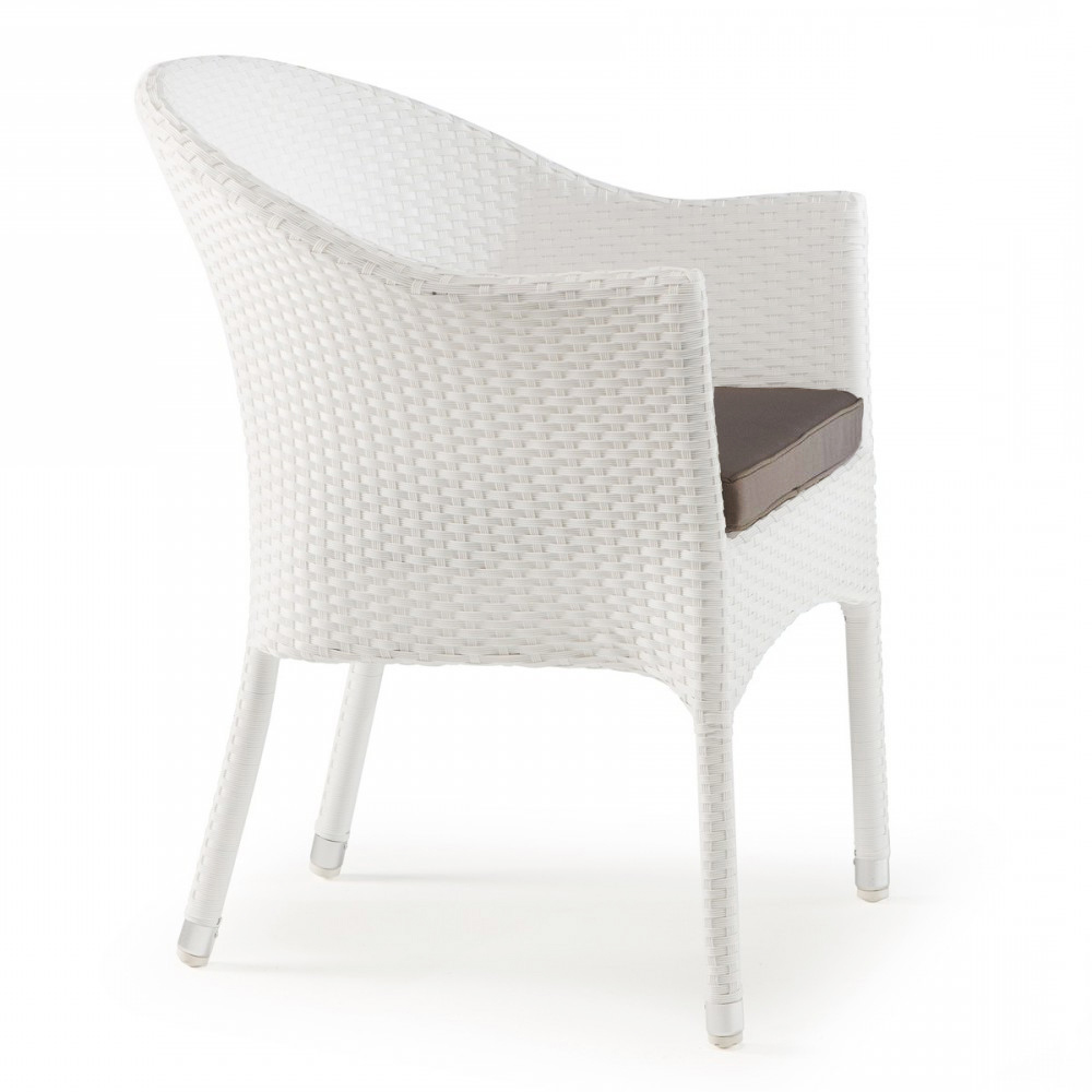 garden armchair made with an aluminum frame covered with white wicker and a seat cushion in mocha-colored fabric.