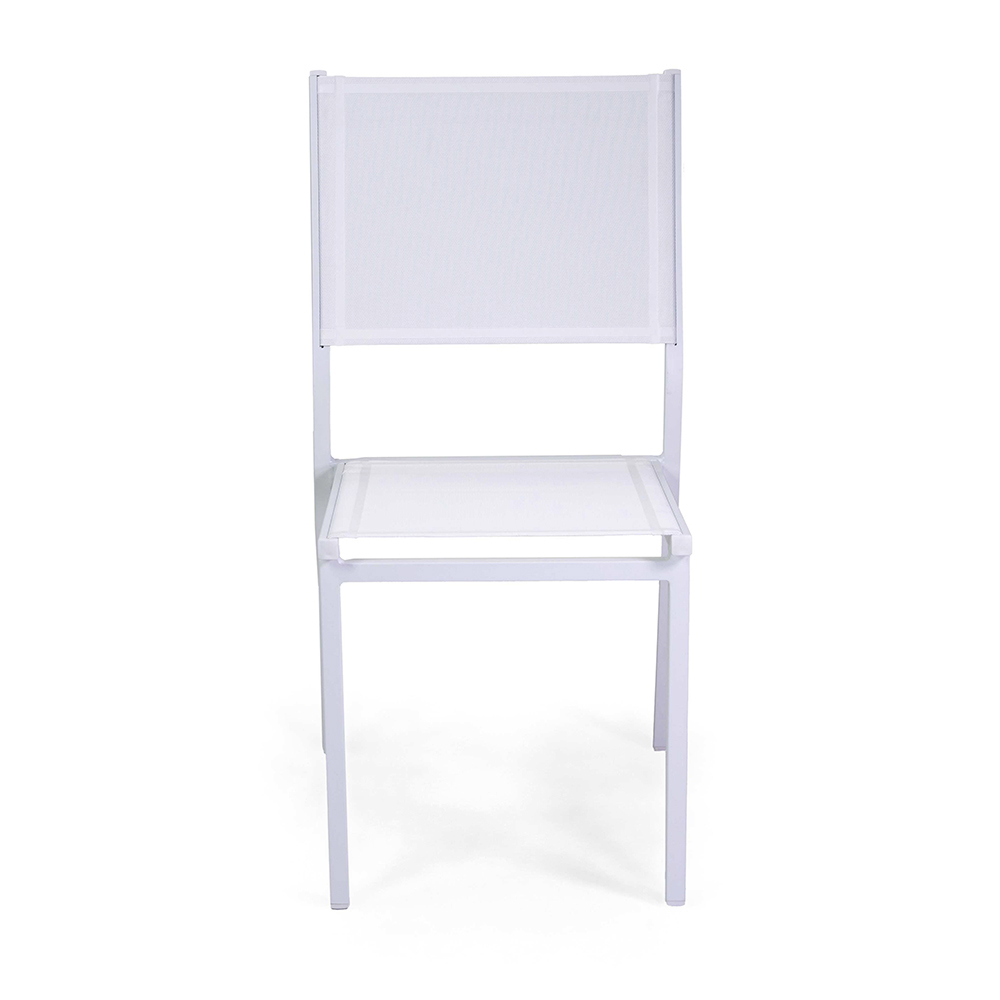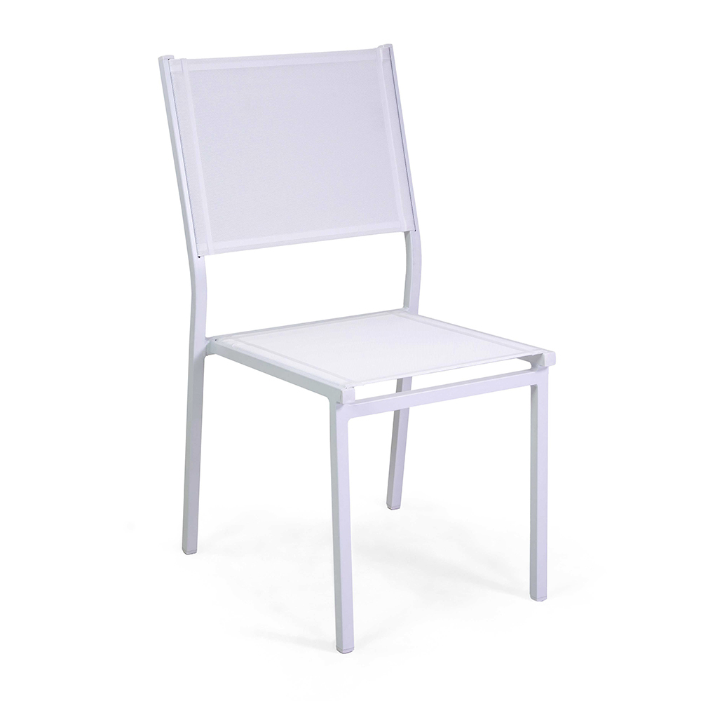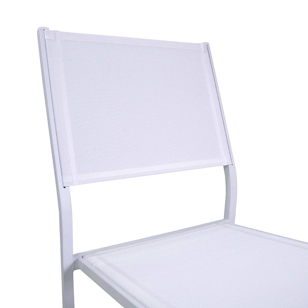 This chair with a white powder-coated aluminum frame represents the ideal balance between functionality and style, perfect for outdoor environments such as gardens and terraces. The white textilene not only gives it a modern and elegant look, but also ensures a comfortable and weather-resistant seat.
