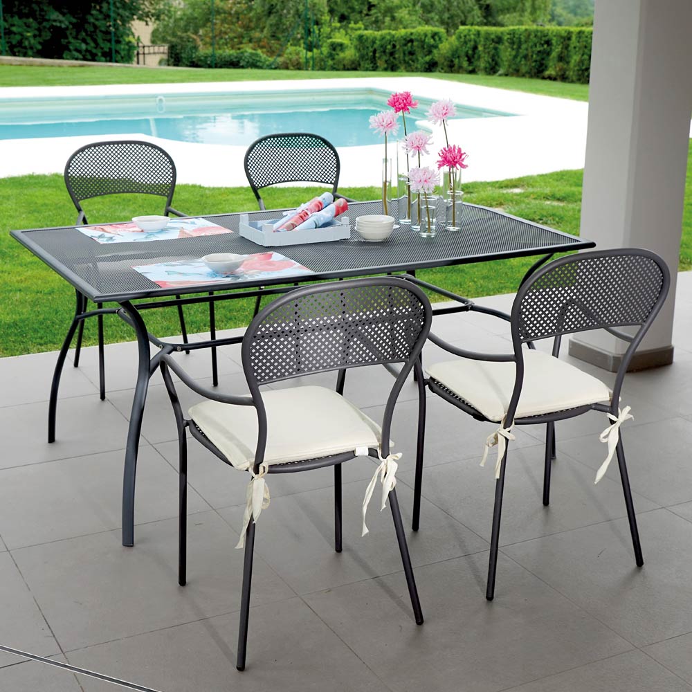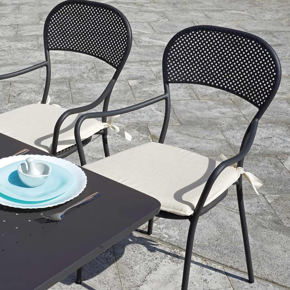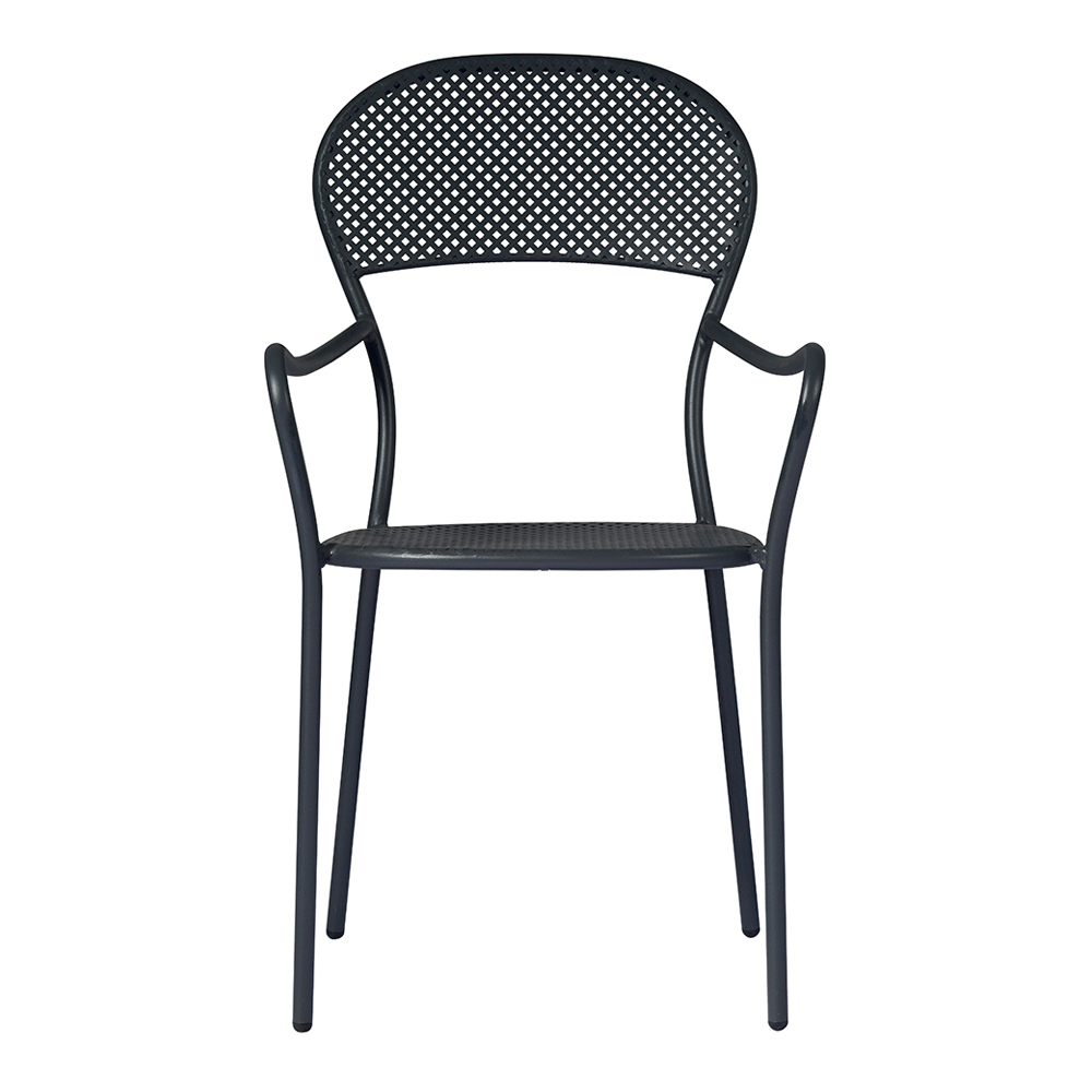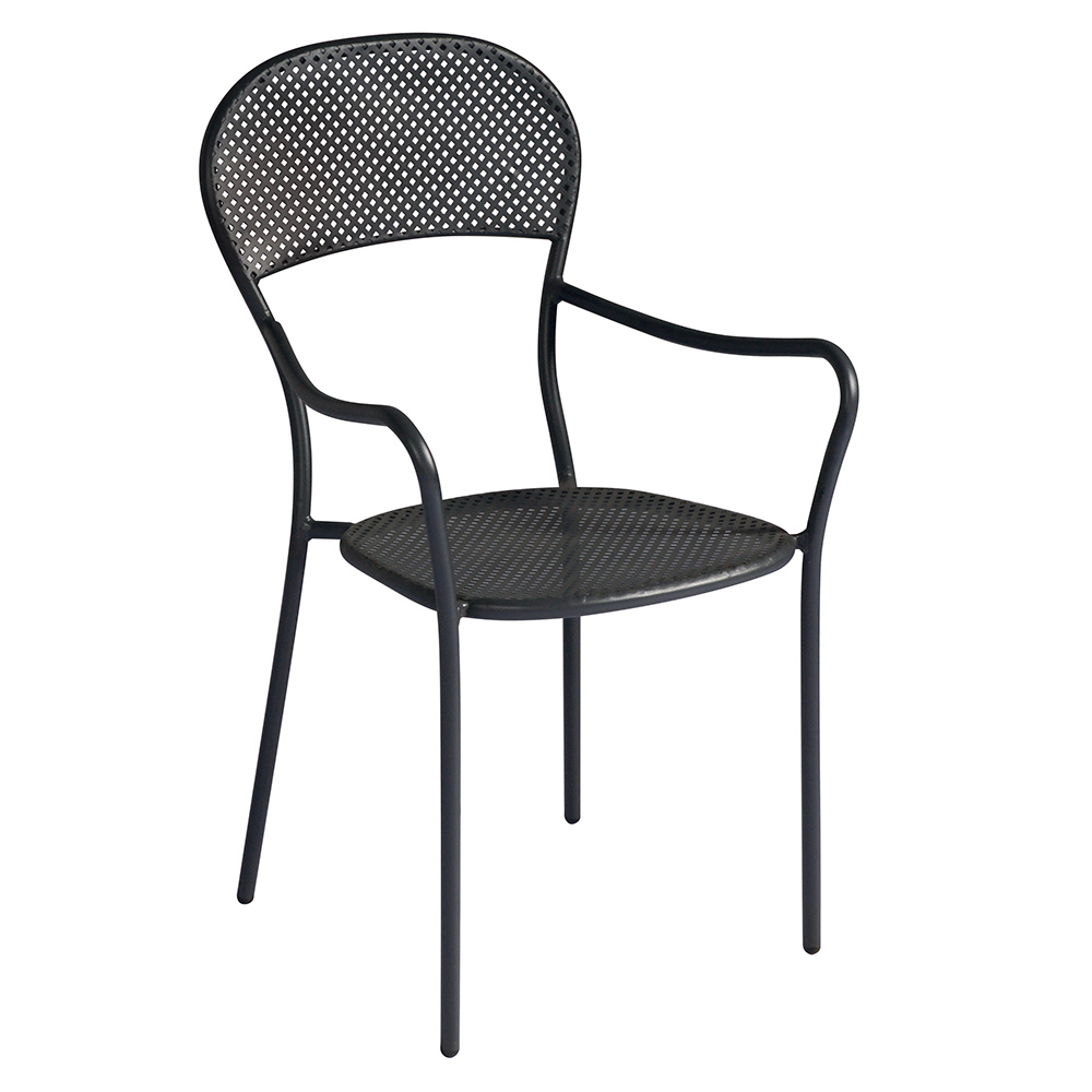 Outdoor chair made of iron with anthracite gray finish with stackable structure complete with practical armrests. This modern piece of furniture has an unmistakable design with a comfortable seat. A furnishing idea capable of giving character and personality to any outdoor environment, from domestic ones such as gardens and terraces to contract spaces such as outdoor bars and restaurants.