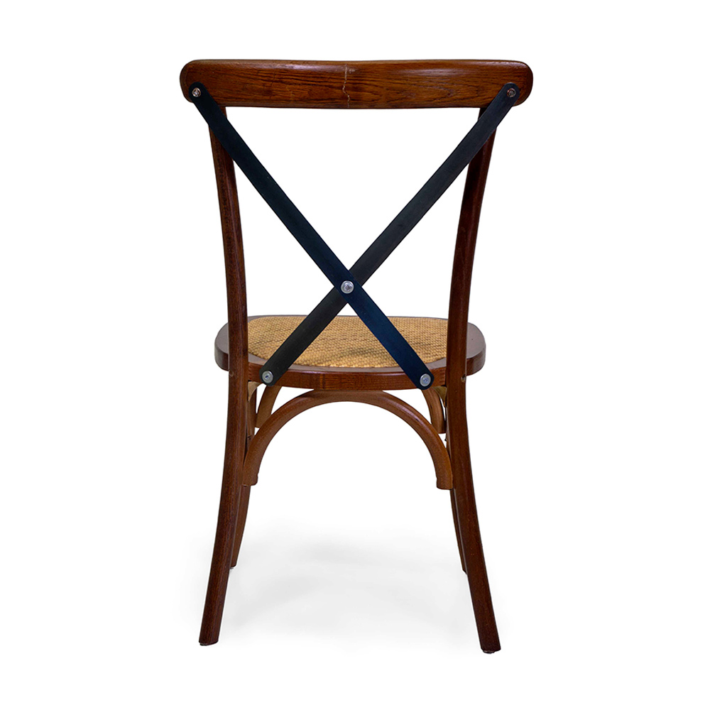 This wooden chair combines the charm of classic design with details that enhance its timeless elegance . The sturdy wooden frame ensures solidity and durability , while the X- shaped iron backrest adds a touch of industrial style that fits perfectly with the traditional aesthetic.