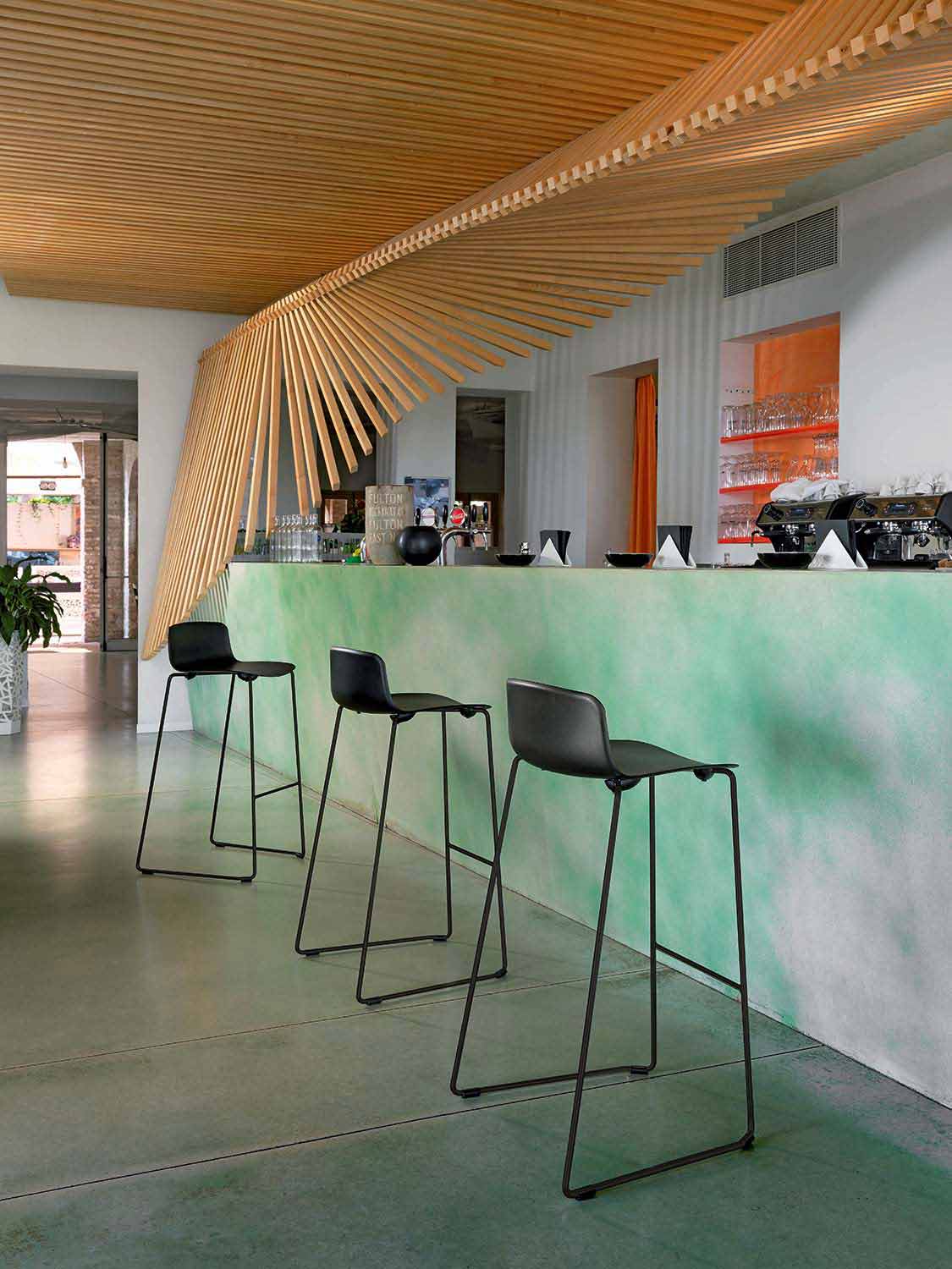 The Charla outdoor stool is characterized by a minimal and modern design that adapts perfectly to any style of furniture thanks to the versatility of the polypropylene shell available in 7 different colors. Charla also has a structure entirely made of metal available in white or black painted metal and it is also possible to choose between 2 different sizes.