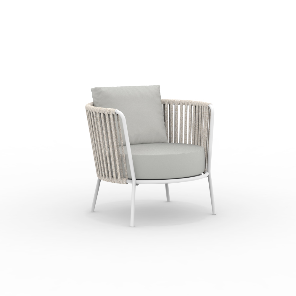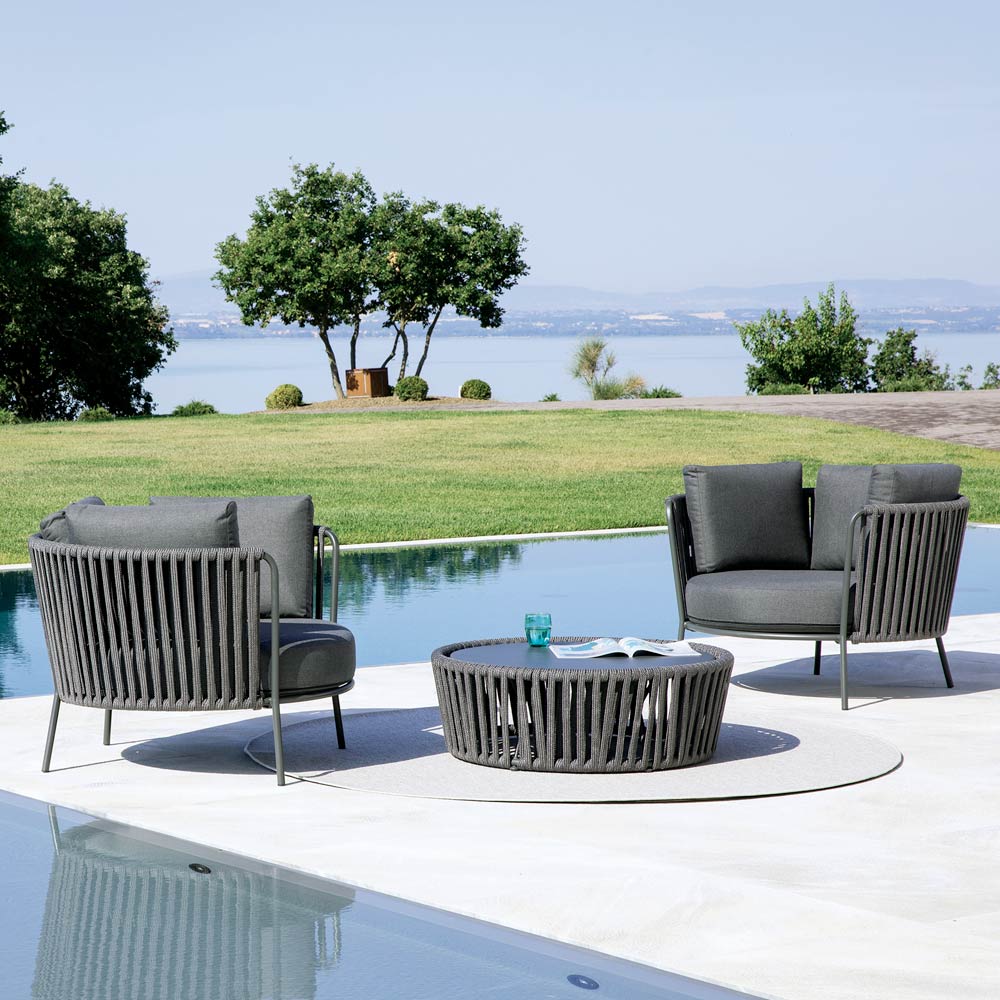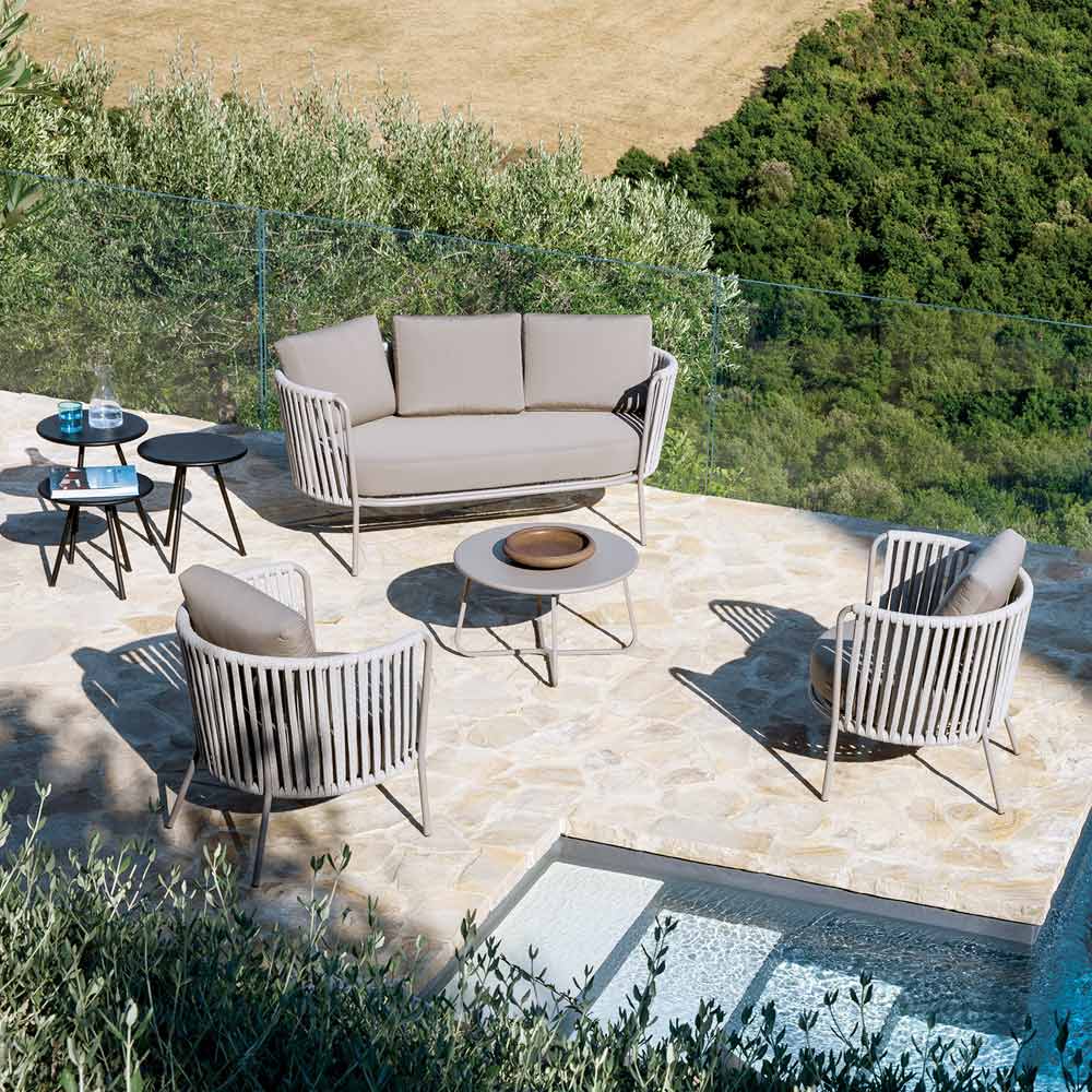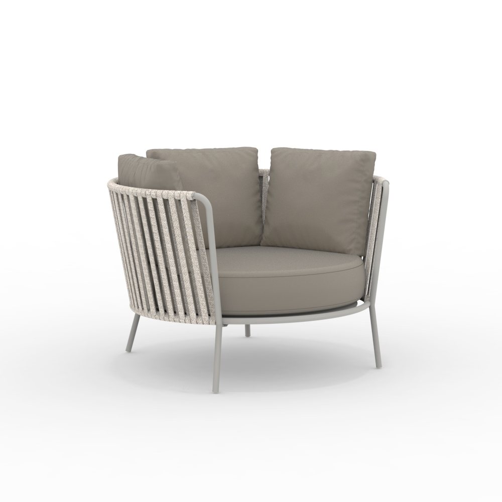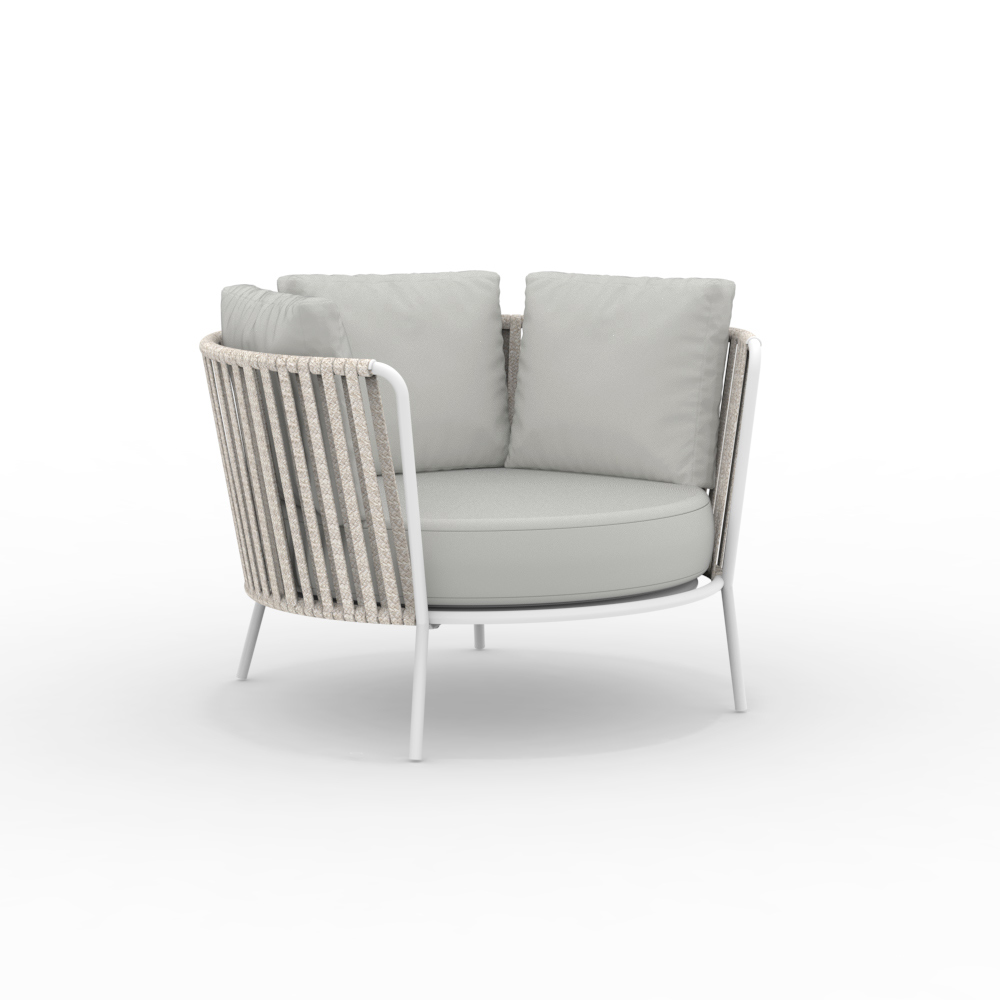 The stainless steel structure guarantees solidity and resistance to atmospheric agents, while the rope weave gives a touch of lightness and refinement, enveloping the seat in a comfortable embrace. The ergonomic design and rounded lines ensure a pleasant and relaxing seating experience.