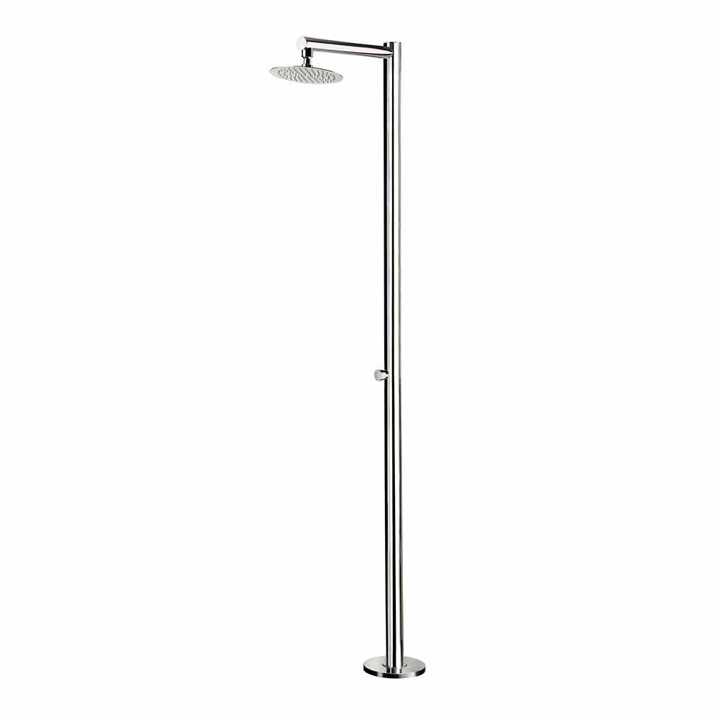 Outdoor shower made in Italy with polished AISI 316L stainless steel column (2 mm thick) and AISI 304 stainless steel shower head. Simple and minimal, this modern design object with a practical and functional style is characterised by a structure that makes it extremely versatile , therefore ideal for the most varied outdoor areas such as beach resorts and tourist facilities but also private environments such as swimming pools and gardens.