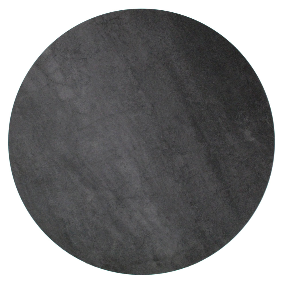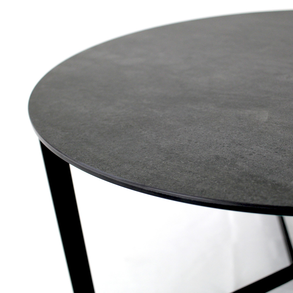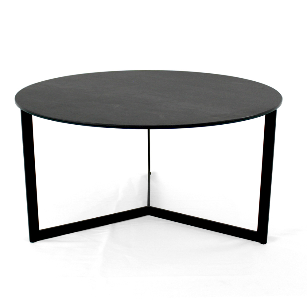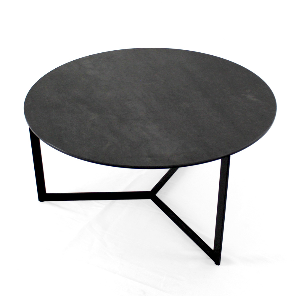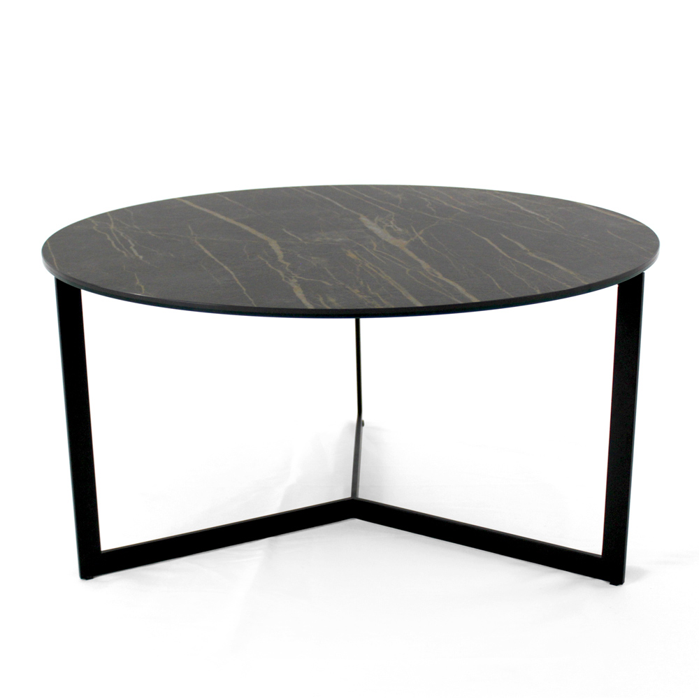 Round coffee table with base made of painted steel and top made of grès porcelain.