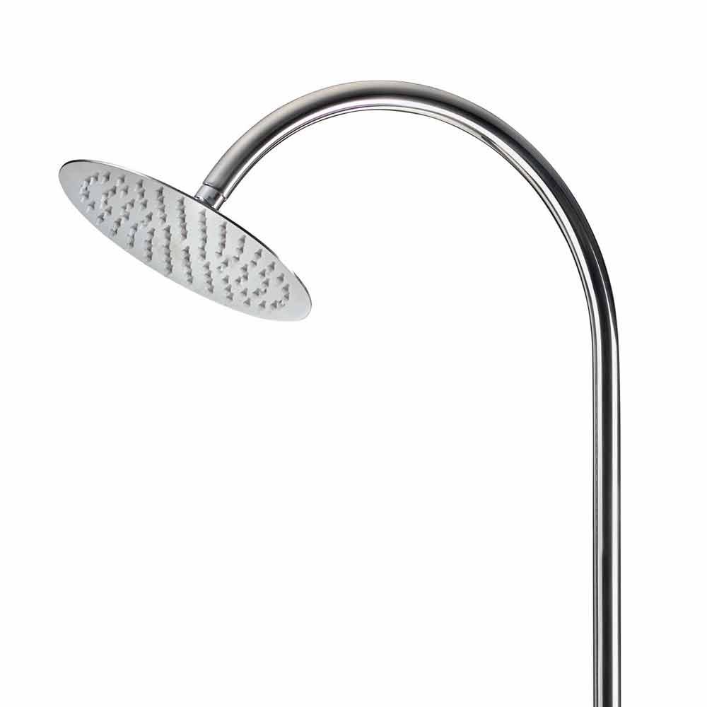 Garden shower column with column, pedestal and shower head holder arm in polished AISI 316L stainless steel (2 mm thick), shower head in AISI 304 stainless steel . Handcrafted in Italy , this outdoor furnishing accessory is characterised by a simple design and modern lines that enrich it with personality and character. Along with its elegant aesthetic appearance, it also has an important functional side as it ensures high-level technical performance made possible by the particular attention to detail and the choice to use high-quality materials. To increase its functionality, the practical timed tap is added which is useful for eliminating or minimising water waste. Ideal for the most varied outdoor areas such as beach resorts and tourist facilities but also private environments such as swimming pools and gardens, this shower only delivers cold water allowing you to cool off on particularly hot and sunny days.