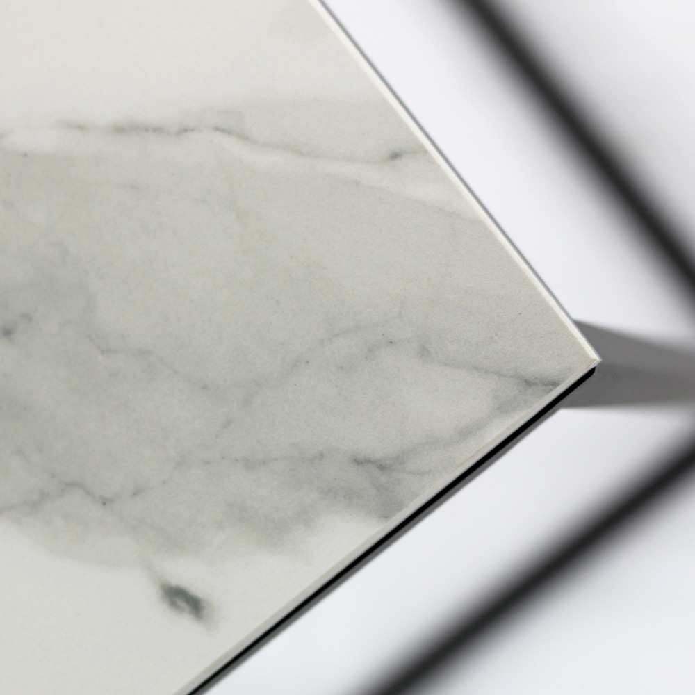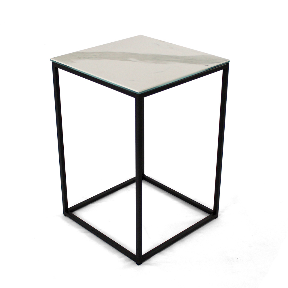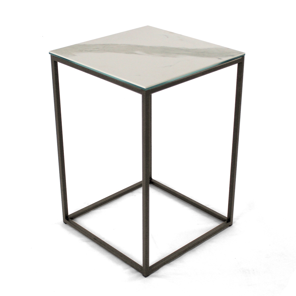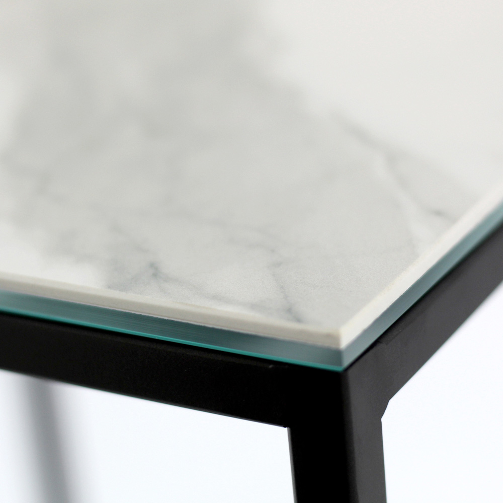 Square coffee table with painted steel base and top in 3mm matt veined statuary white stoneware laminated with 6mm float glass. The modern style coffee tables represent the perfect piece of furniture to complete the decoration of any living room and living room. These products are unique, elegant and functional at the same time thanks to their simple and harmonious finishes that make them suitable for any need and occasion of use. The materials used for the construction guarantee great quality and resistance even with the passage of time.