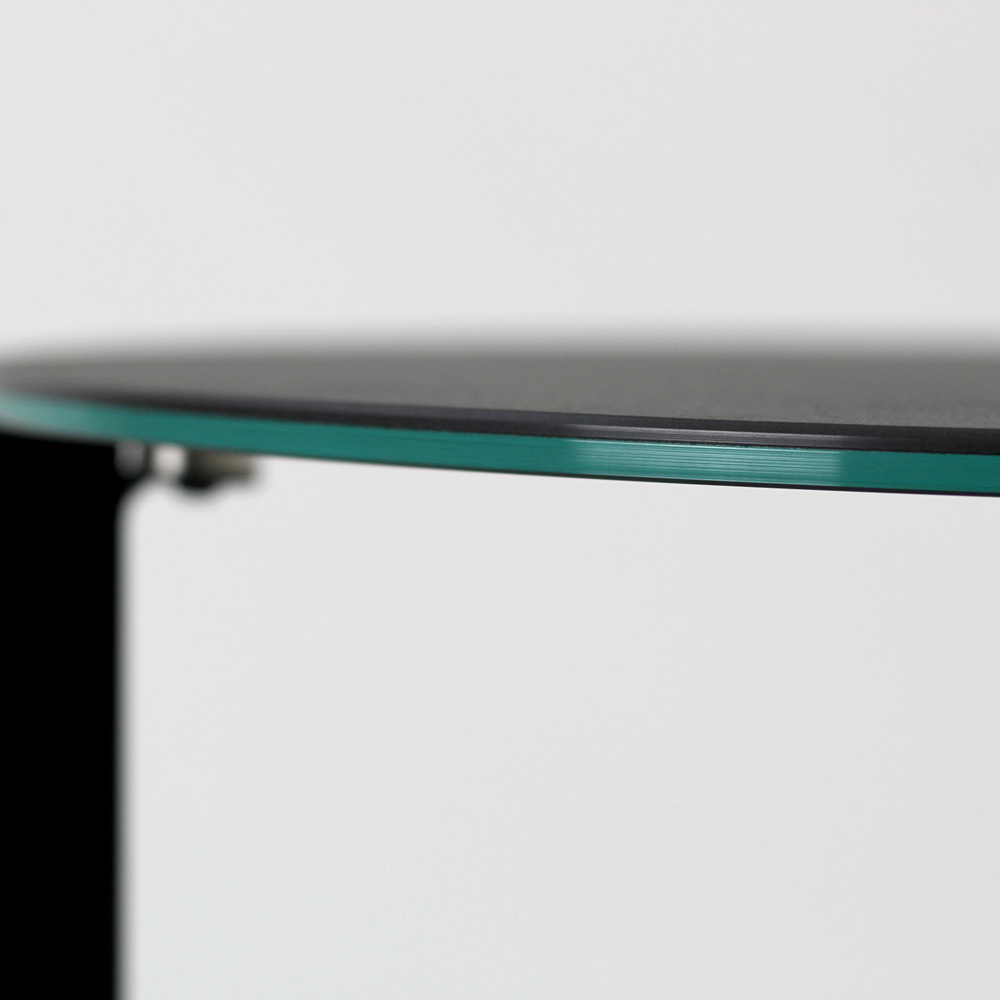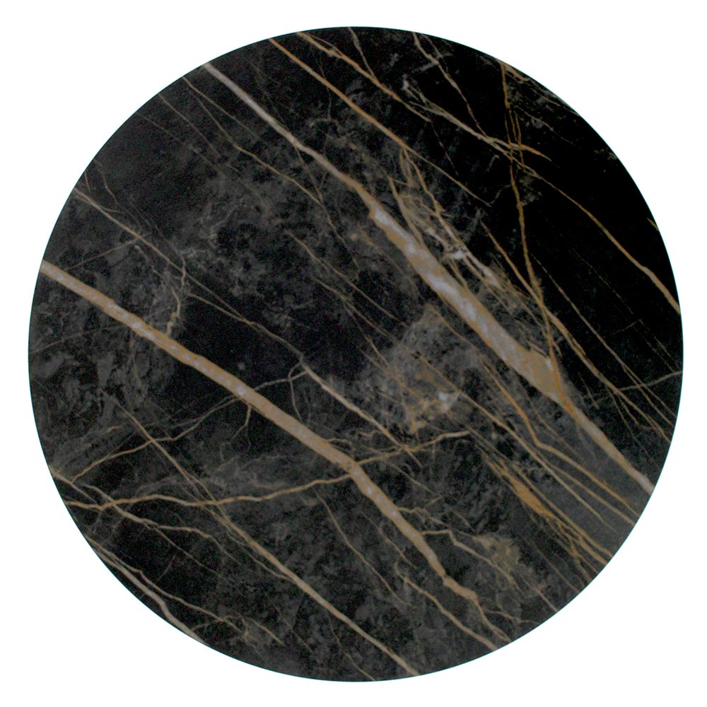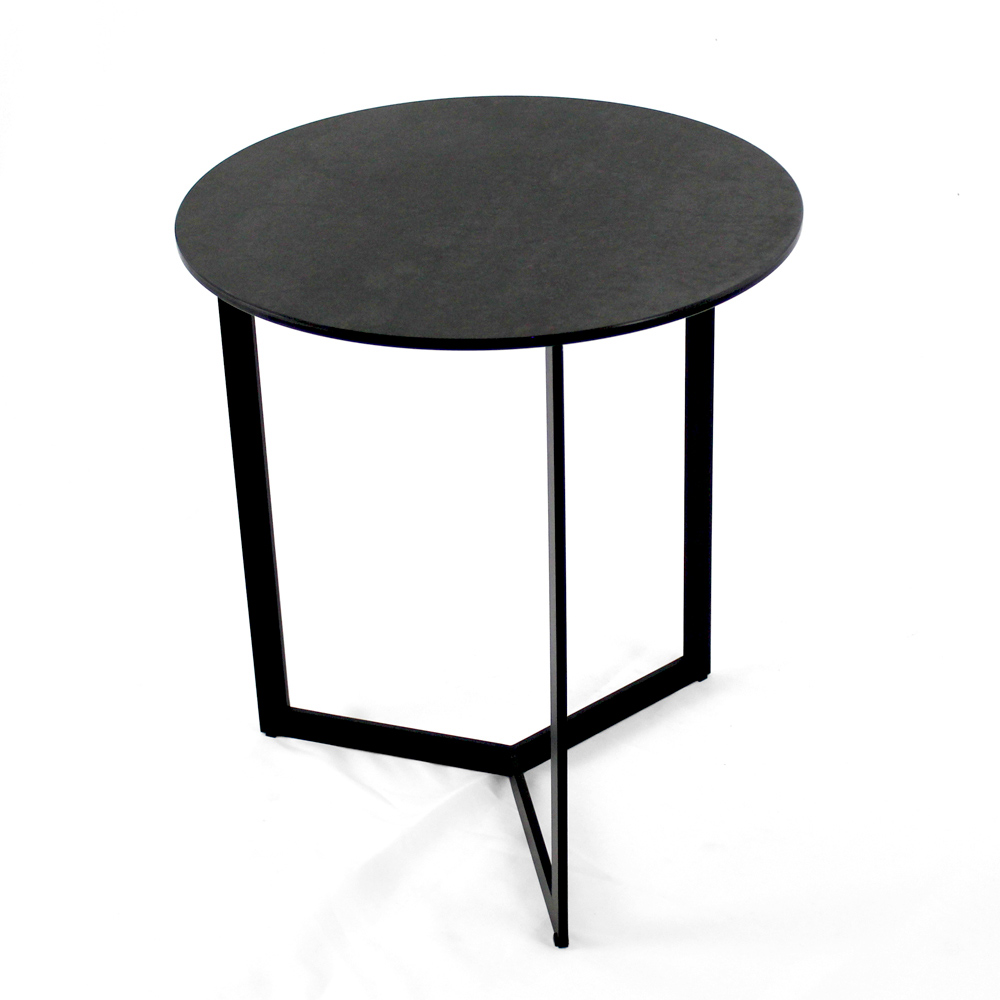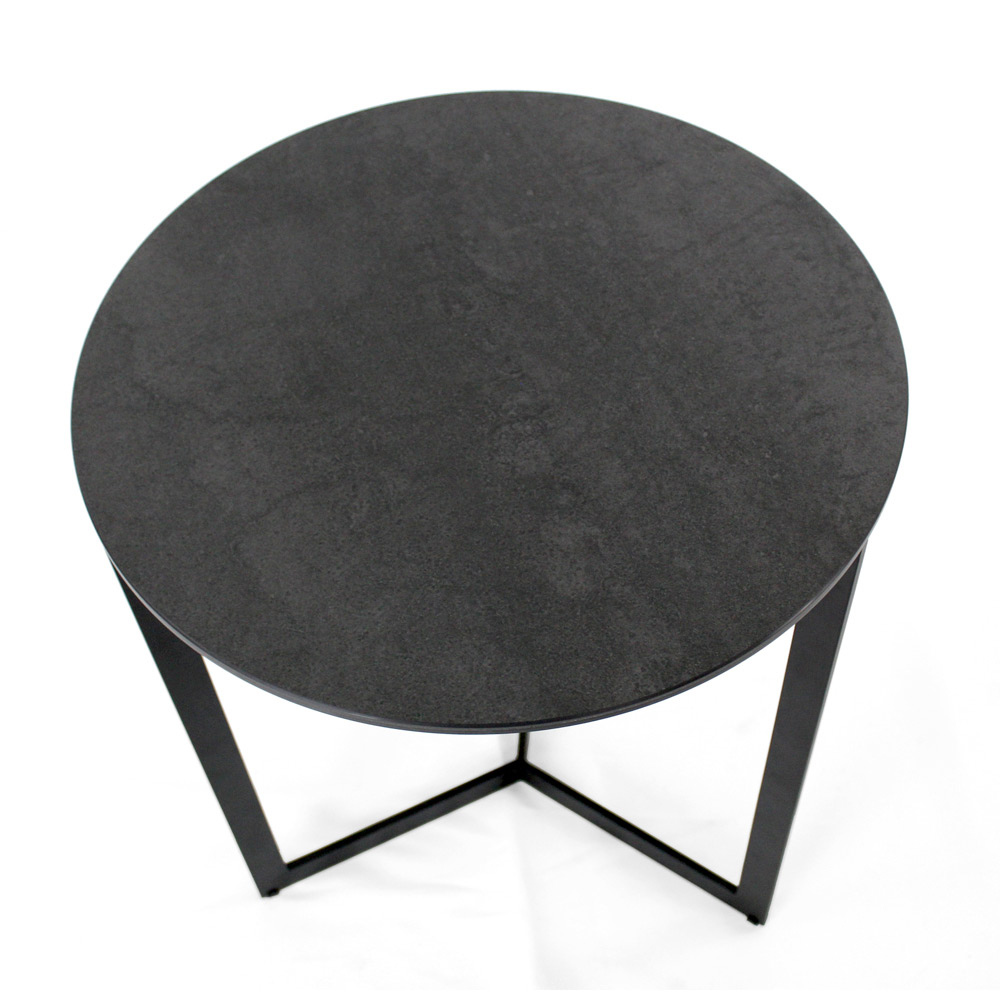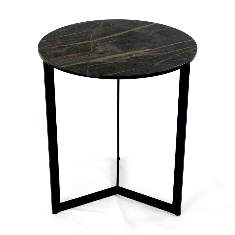 Round coffee table with base made of painted steel and top made of grès porcelain.