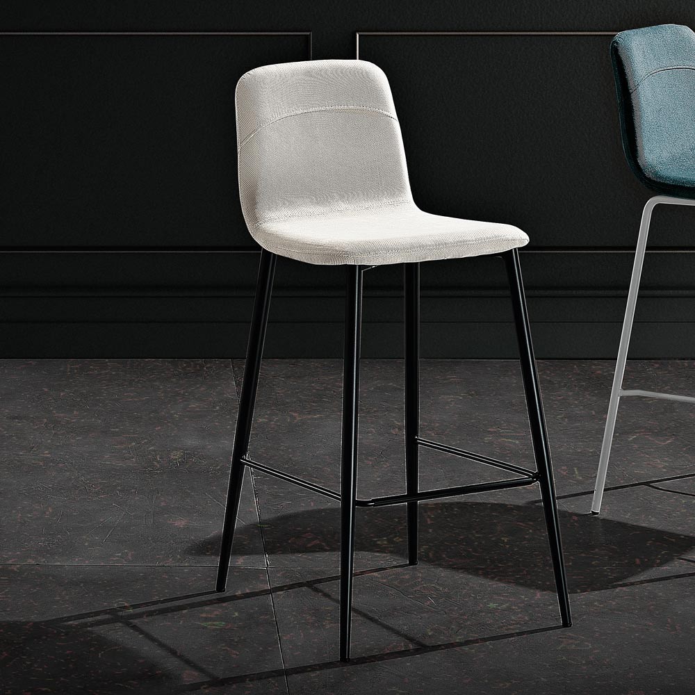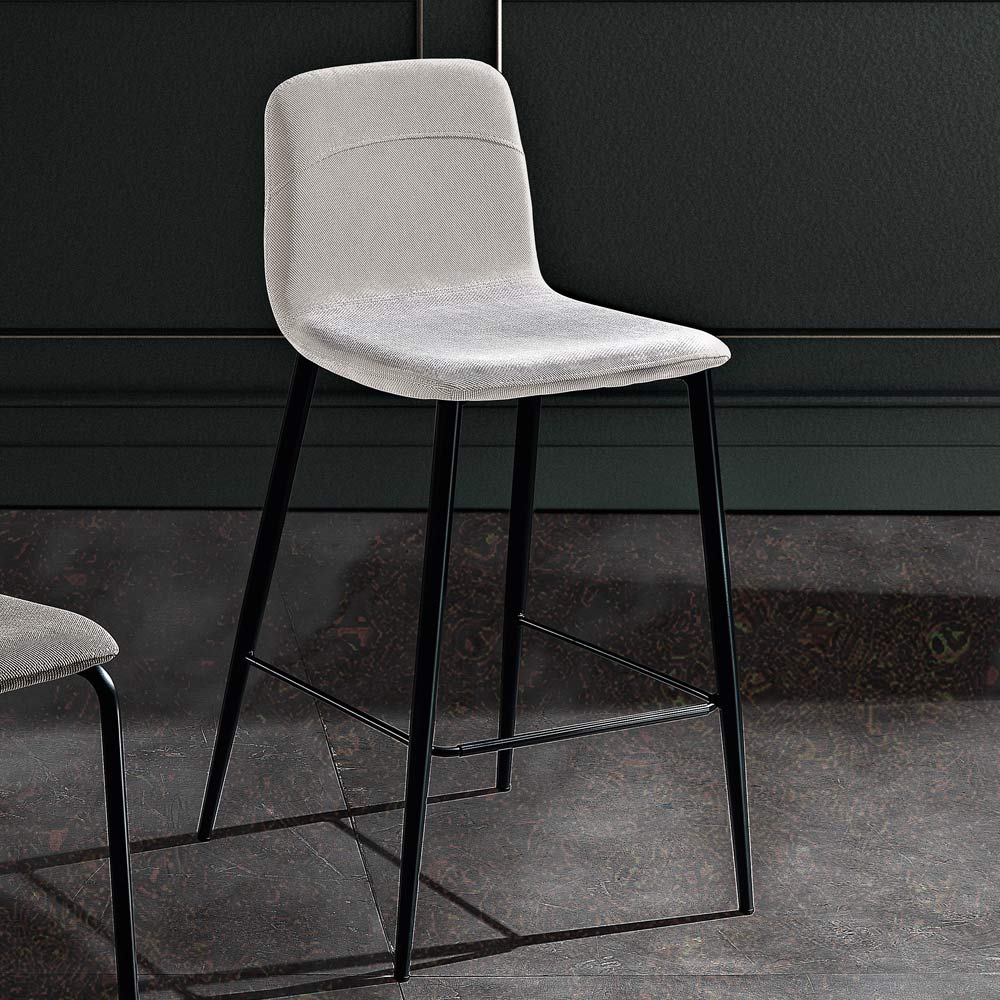 Kitchen stool with seat covered in fabric and metal frame with round tube (diameter 16 mm) in matt anthracite finish RAL 7021 complete with practical footrest, made in Italy.