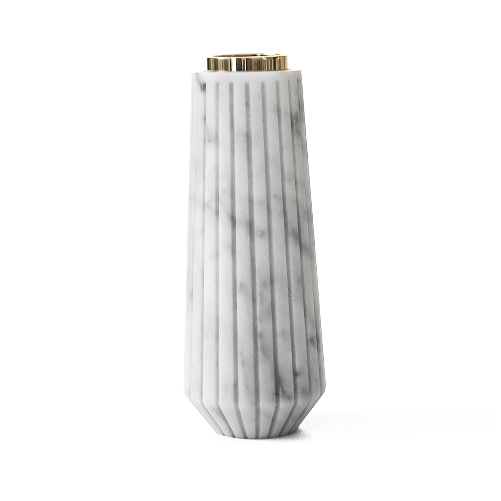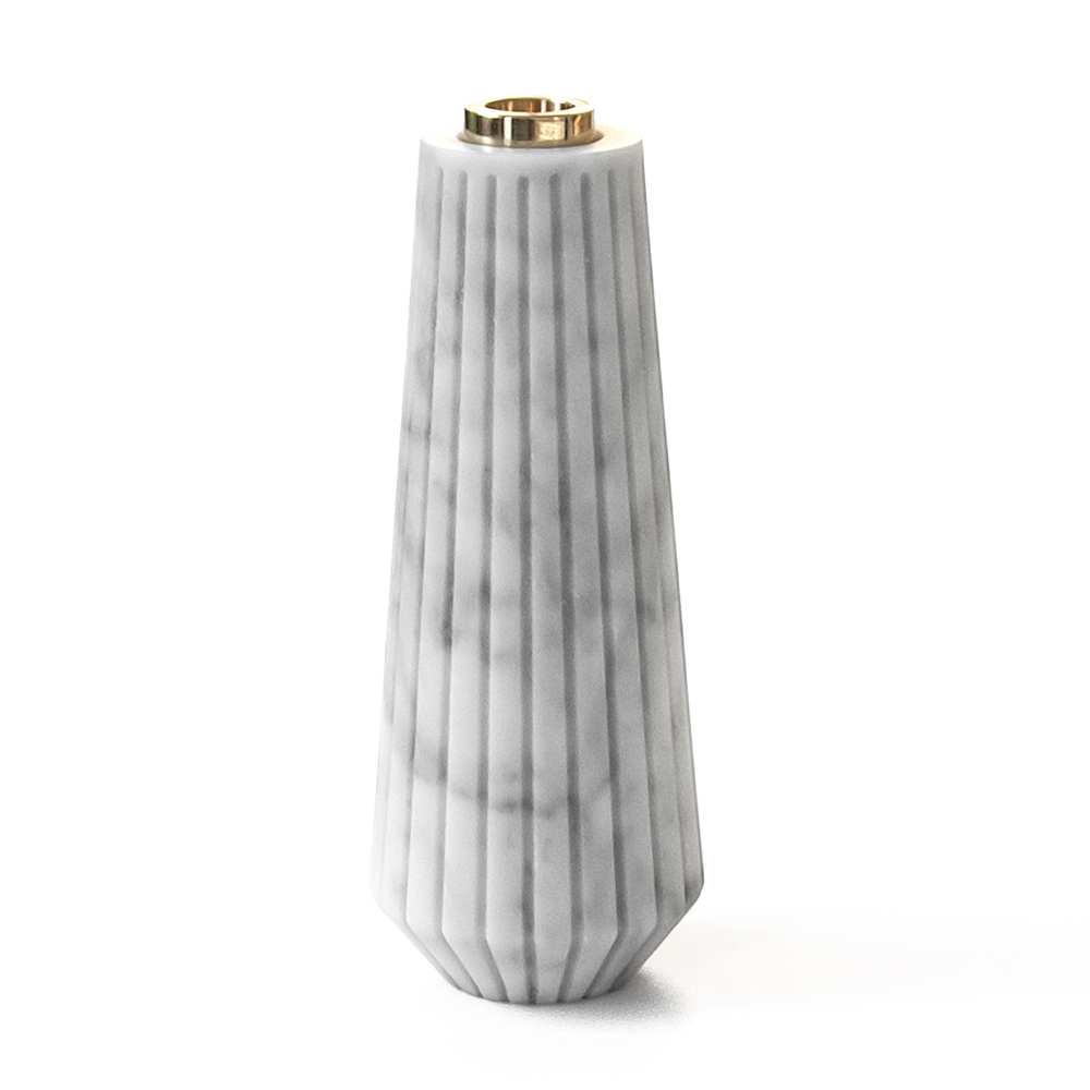 Large striped candle holder in white Carrara marble and brass, made in Italy.