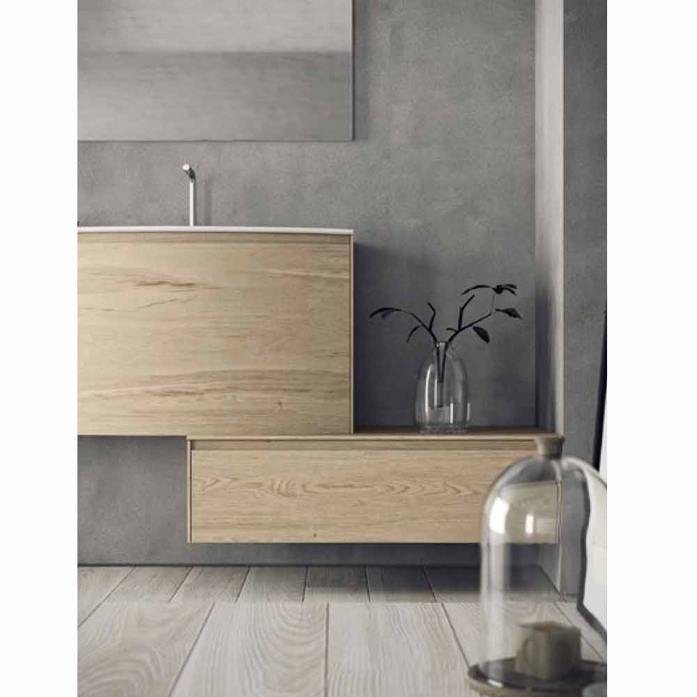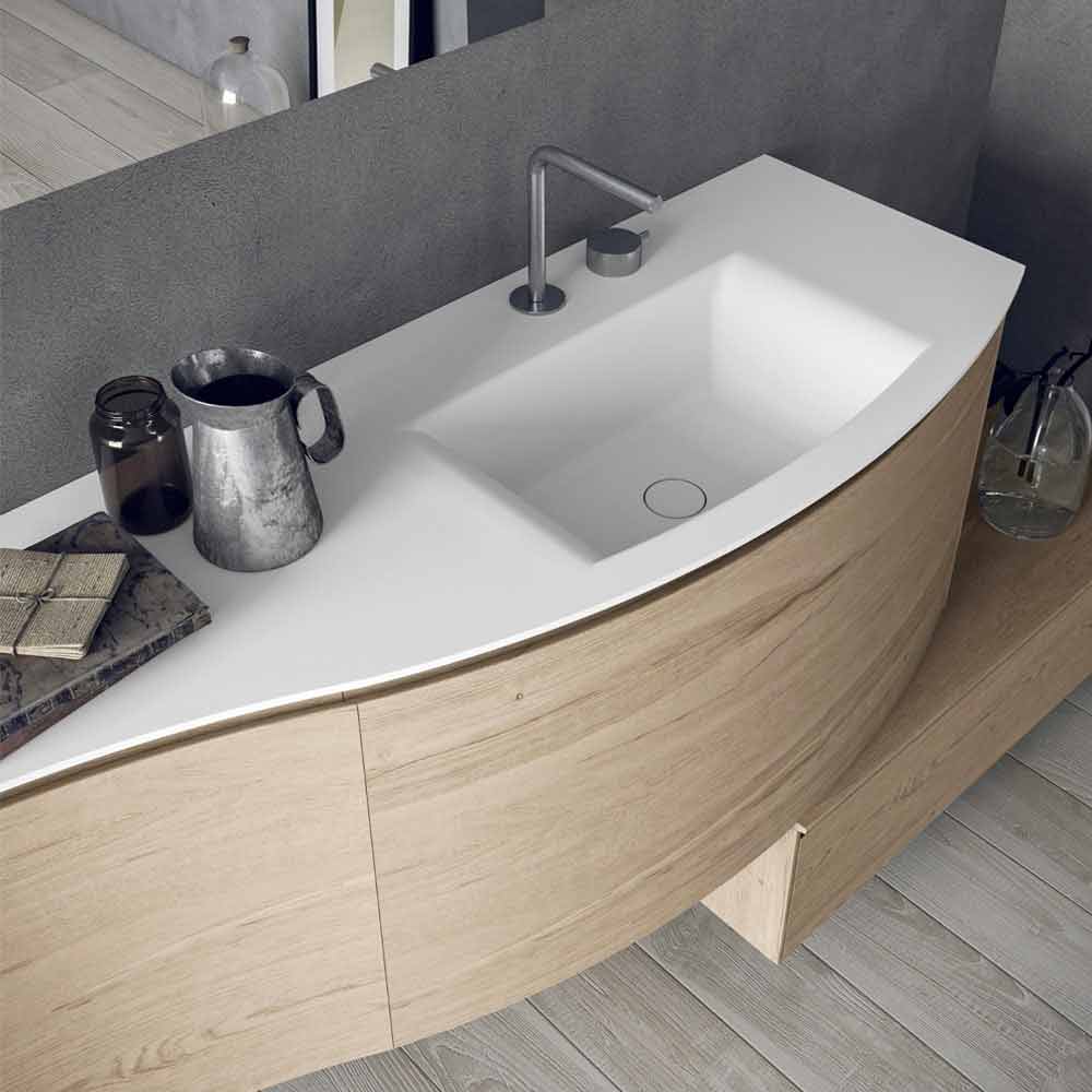 The peculiarity of this composition is given by the built-in washbasin characterized by two lateral sides that gently descend towards the basin and by the underlying curved wall unit, which breaks the regularity of the structure for a more welcoming atmosphere.