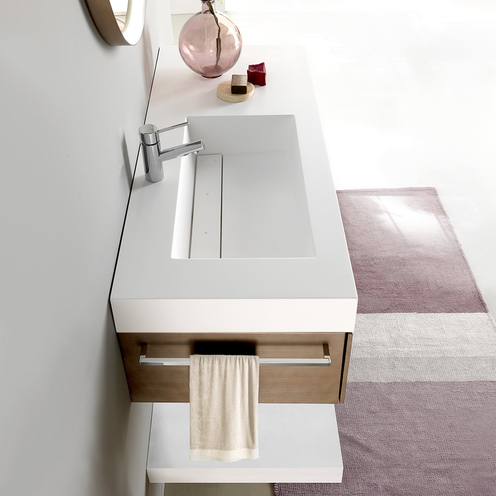 The elegant 10 cm thick top is made of opaque white stonelight resin with integrated basin with free drainage, covered by a refined plate of the same material.