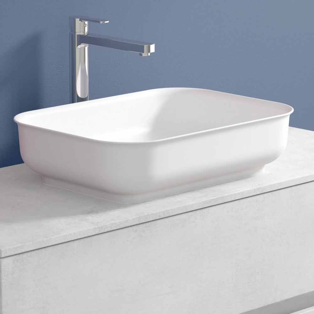 The rectangular countertop washbasin is made of Solid matt, an opaque white mineral resin , and finished in opaque gelcoat , which makes the product waterproof.