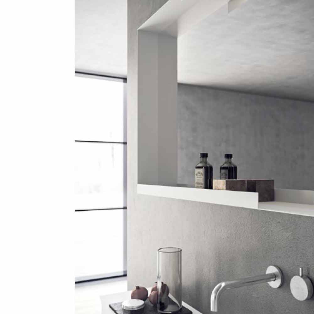 This formal clarity is given by the groove door with an inclined profile. The peculiarity of this composition is given by the built-in washbasin characterized by two lateral sides that gently descend towards the basin.