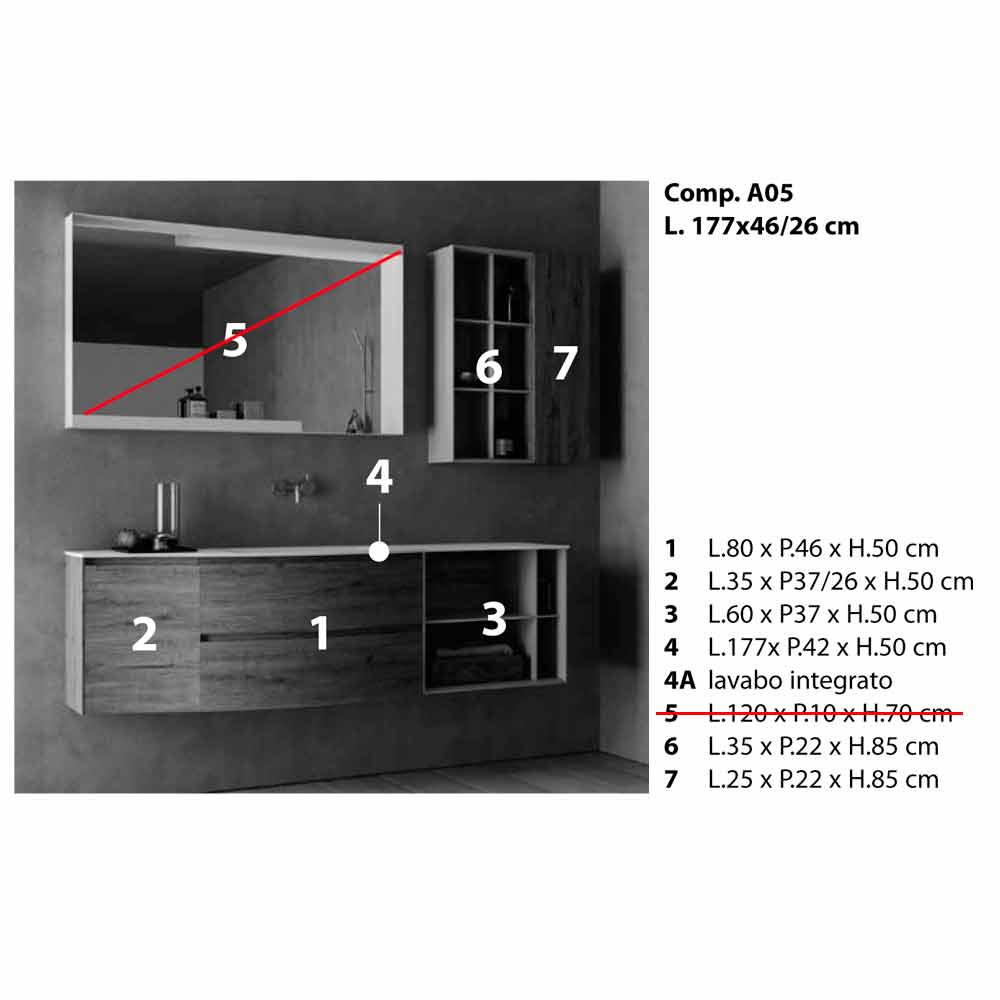 The composition includes: 1 L.80 x P.46 x H.50 cm 2 L.35 x P37 / 26 x H.50 cm 3 L.60 x P37 x H.50 cm 4 L.177x P.42 x H.50 cm 4A integrated washbasin 6 L.35 x P.22 x H.85 cm 7 L.25 x P.22 x H.85 cm