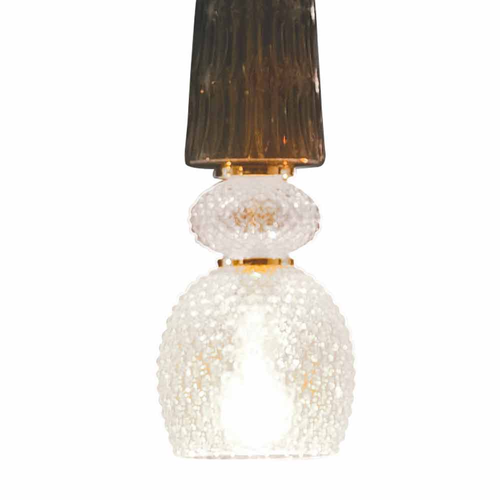 Elegant suspension lamp made in Italy in Murano glass with antique decoration, gold details and anthracite fabric cable . From the perfect fusion between modernity and tradition comes this wonderful furnishing idea capable of illuminating creating a splendid warm and welcoming atmosphere and at the same time enriching the aesthetics of the room thanks to a timeless elegance given by Murano glass, a high quality material. and with a particularly refined personality . The play of geometric shapes and different colors creates a dynamic effect that completes the look of the lamp, emphasizing its value and value.