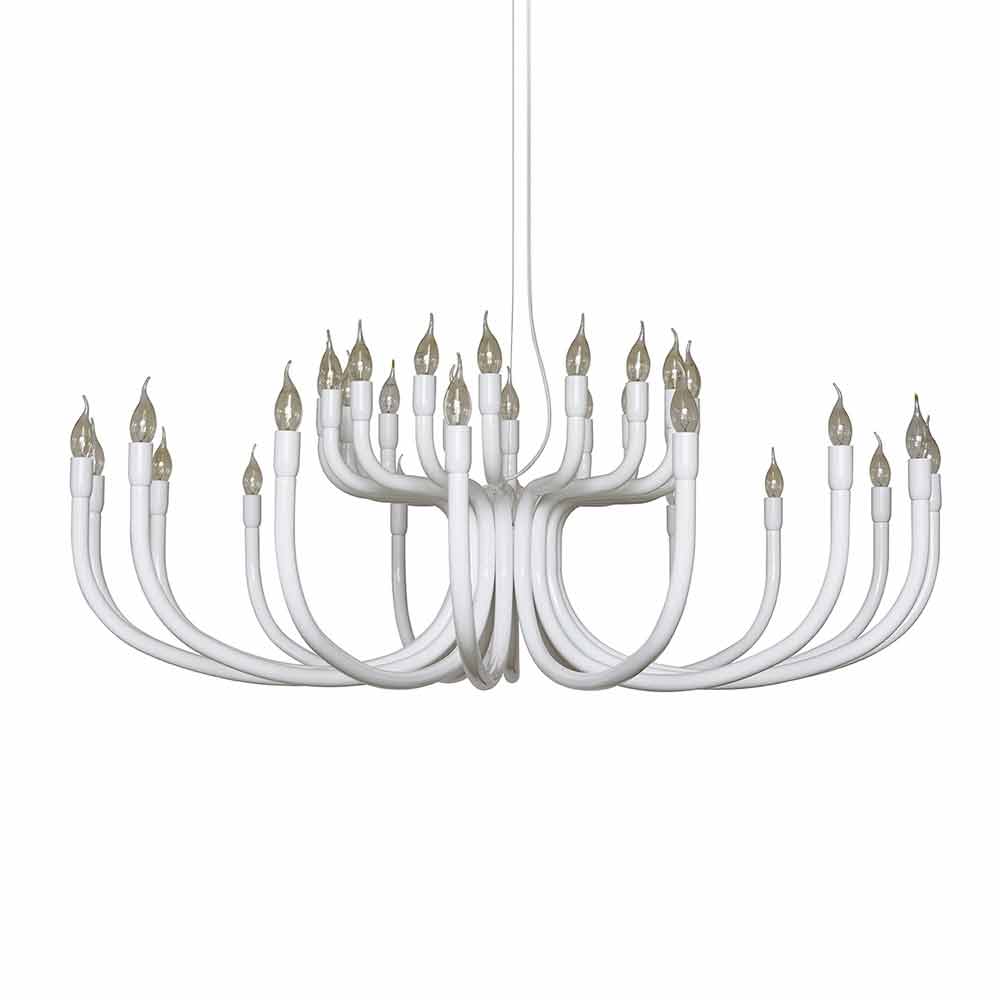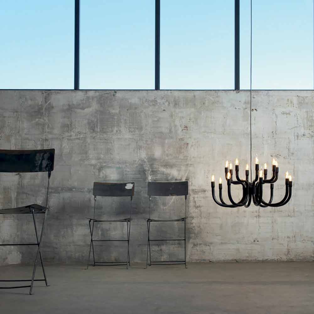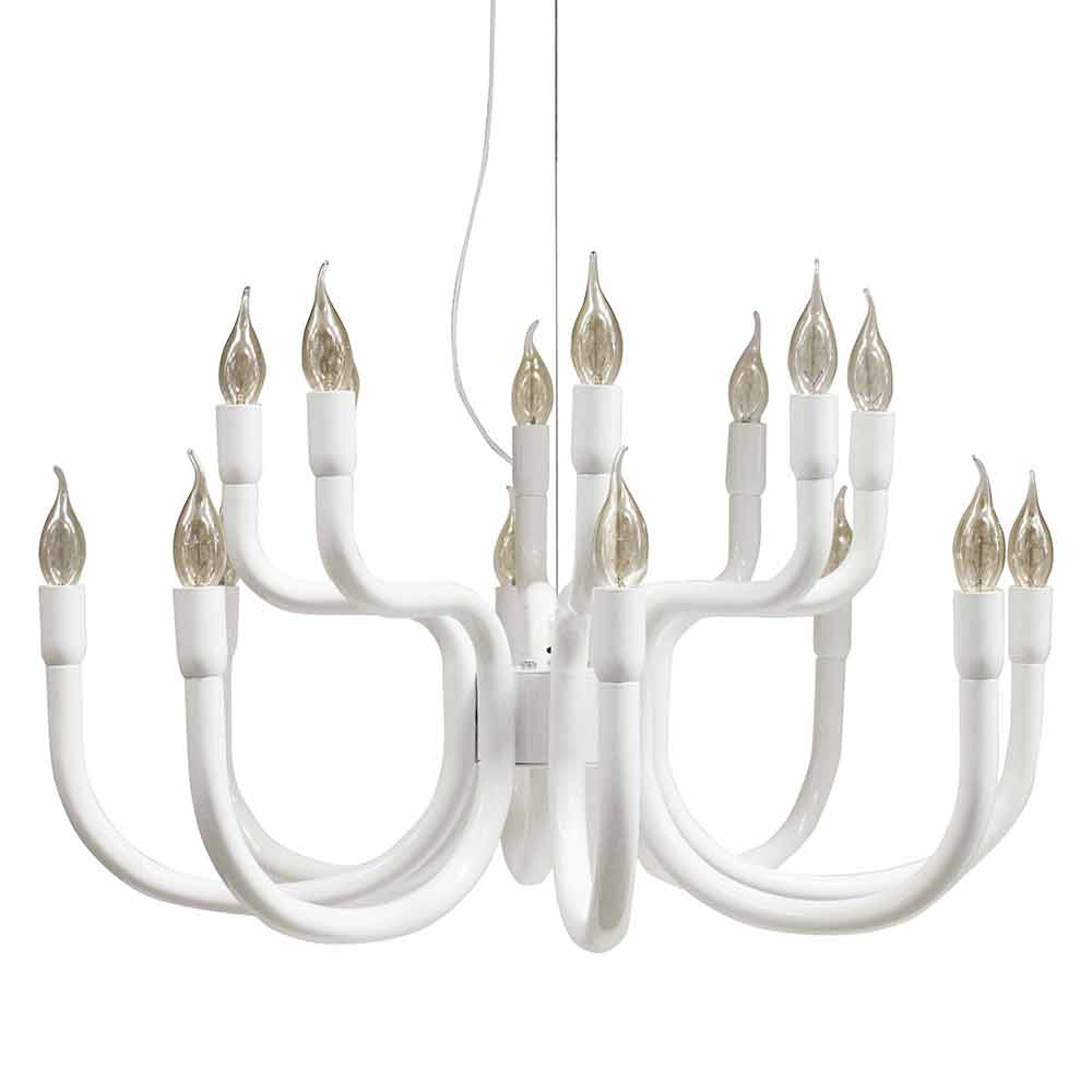 This original and singular suspension chandelier for the dining room or living room draws inspiration in form from the ancient chandeliers of the palaces, in full Baroque style rich in decorations, but is nevertheless revisited in a modern key with an extremely simple design to be inserted into spaces of different types, always keeping its stage presence alive.