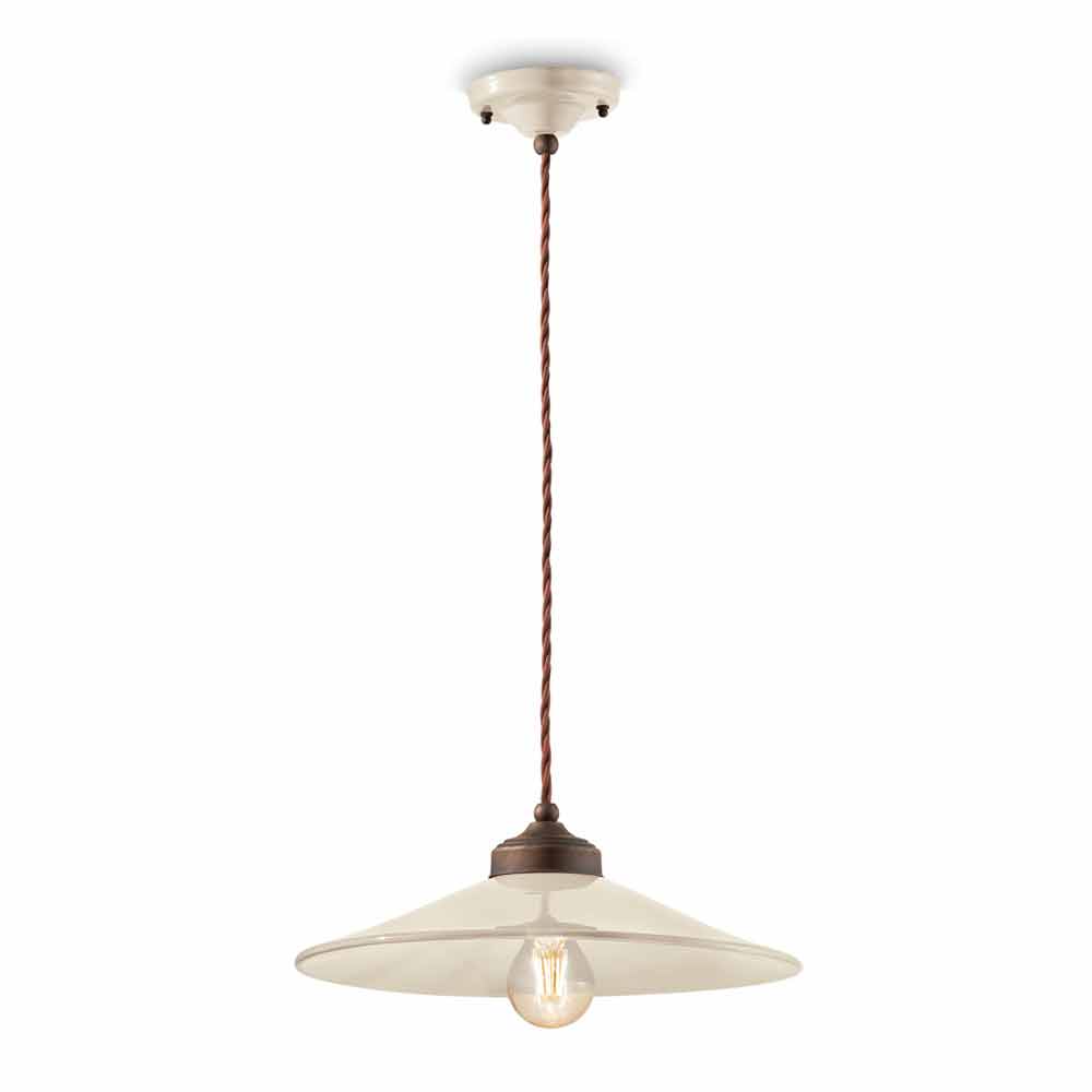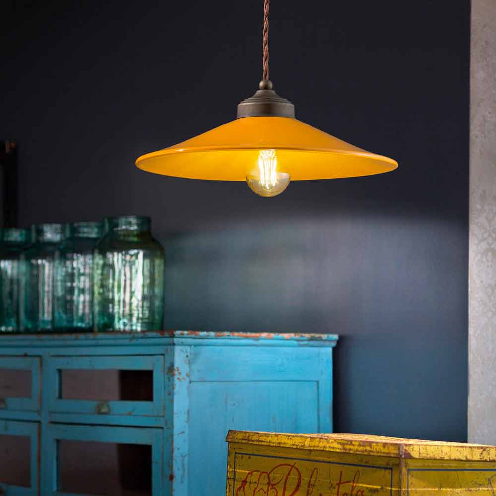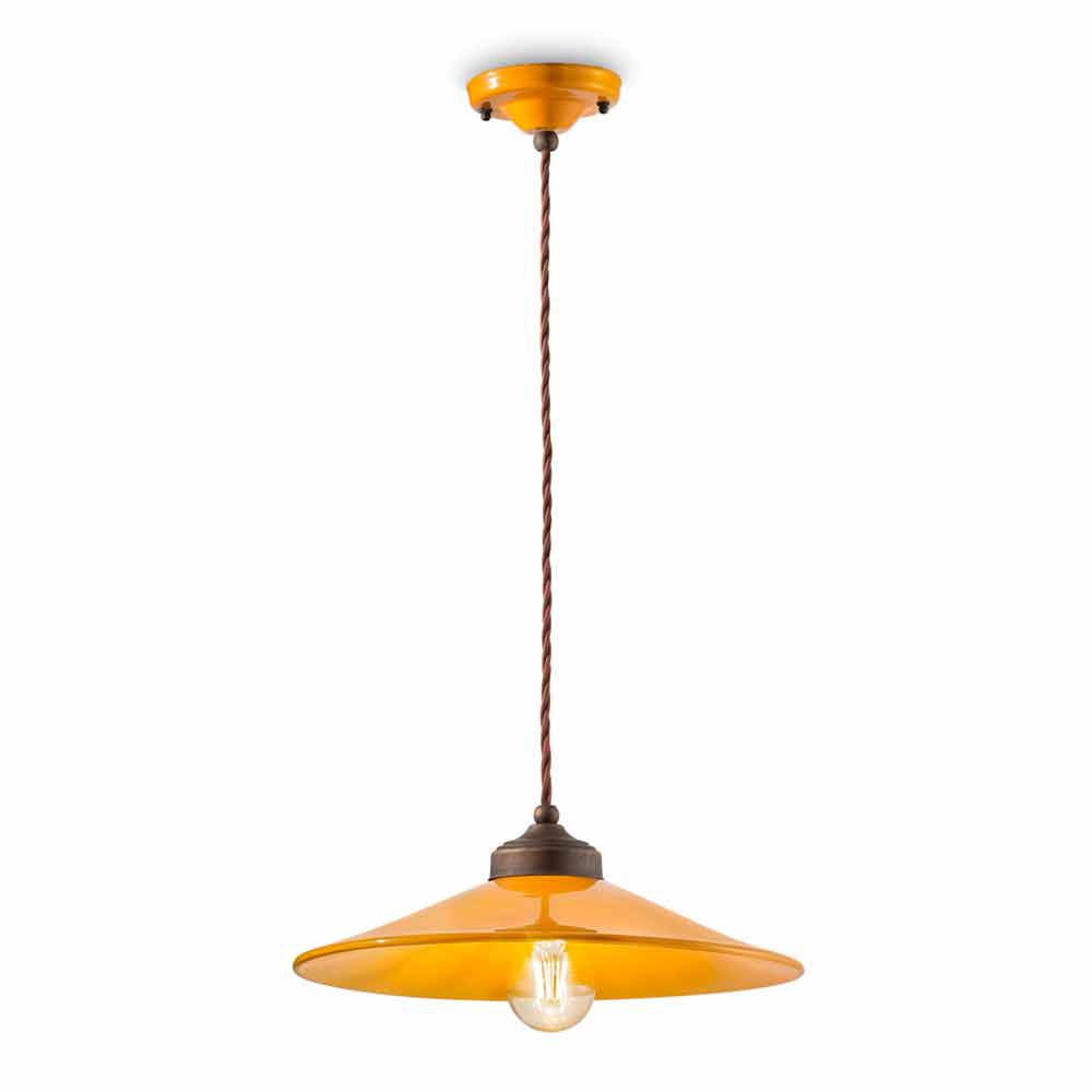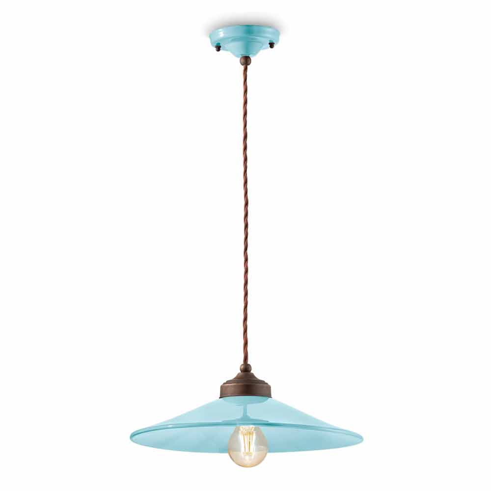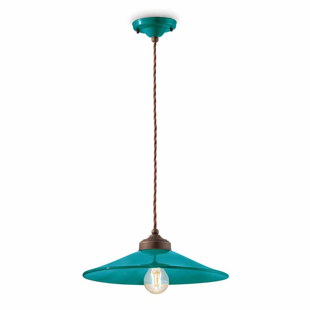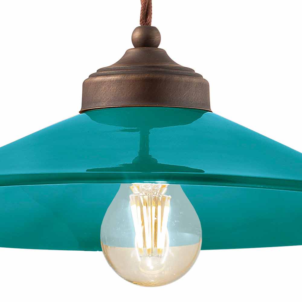 Suspension in colored ceramic and antique brass Maya by Ferroluce Maya is a fantastic suspension lamp, with a rertò style revisited in a modern key, handmade by skilled artisans in Italy. This beautiful suspension consists of an antique brass structure with a diffuser made of glossy colored ceramic, available in different colors. Colored ceramic goes well with antique brass and this union is the strong point of this lamp. Suspension created for environments with an enveloping atmosphere, it is able to satisfy the most demanding requests thanks to a unique and original design. A design that is opposed to luxury but which coexists harmoniously with it. Design that preserves the essentiality of use and reassures with a delicate balance between shapes and tones. The wide and diffused light brings a warm and welcoming atmosphere to all the environments in which it is inserted. It is these simple and delicate shapes that attract attention, and that make Maya able to adapt to any decor from the simplest and most minimal to the most classic, creating a delicate contrast. Bring a touch of design to your home too! Small details for a great effect with an antique flavor! Lamp available in different finishes. Check the color chart and enter the code of the finish you want in the appropriate box!