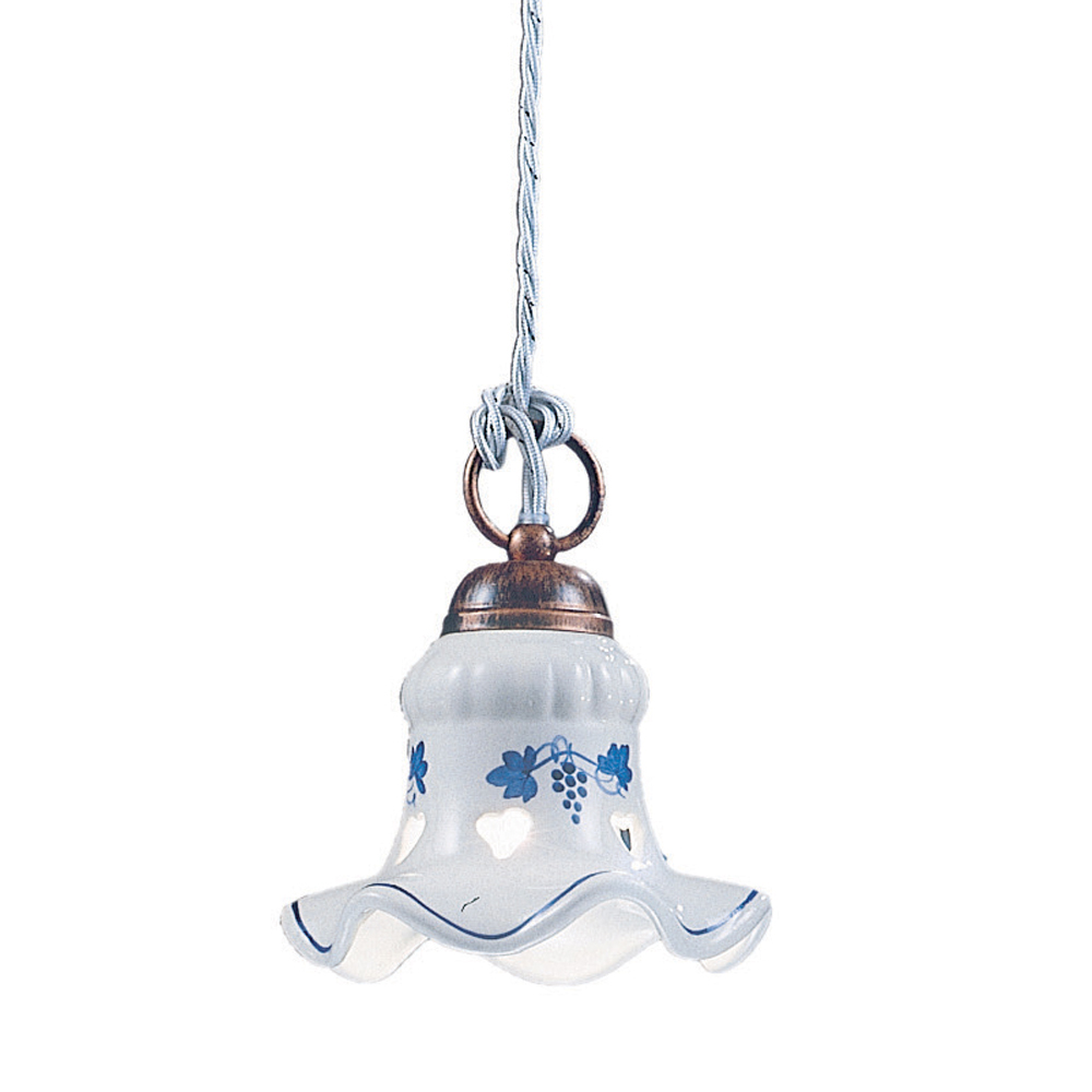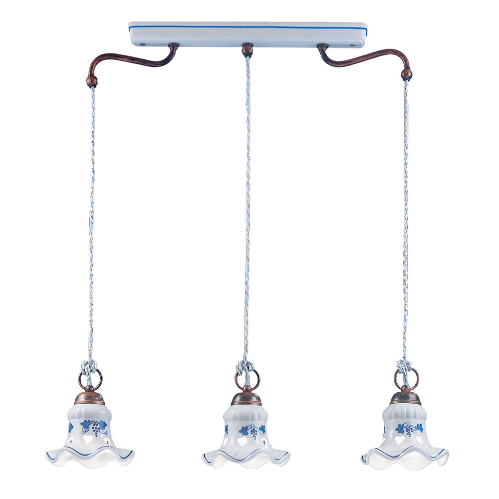 The 3-light suspended lamp is entirely made of iron and ceramic with delicate hand-painted decorations that highlight the craftsmanship and dexterity of the craftsmen.