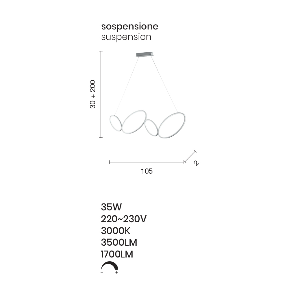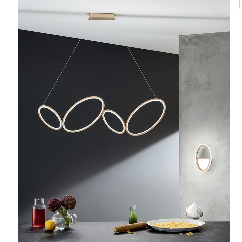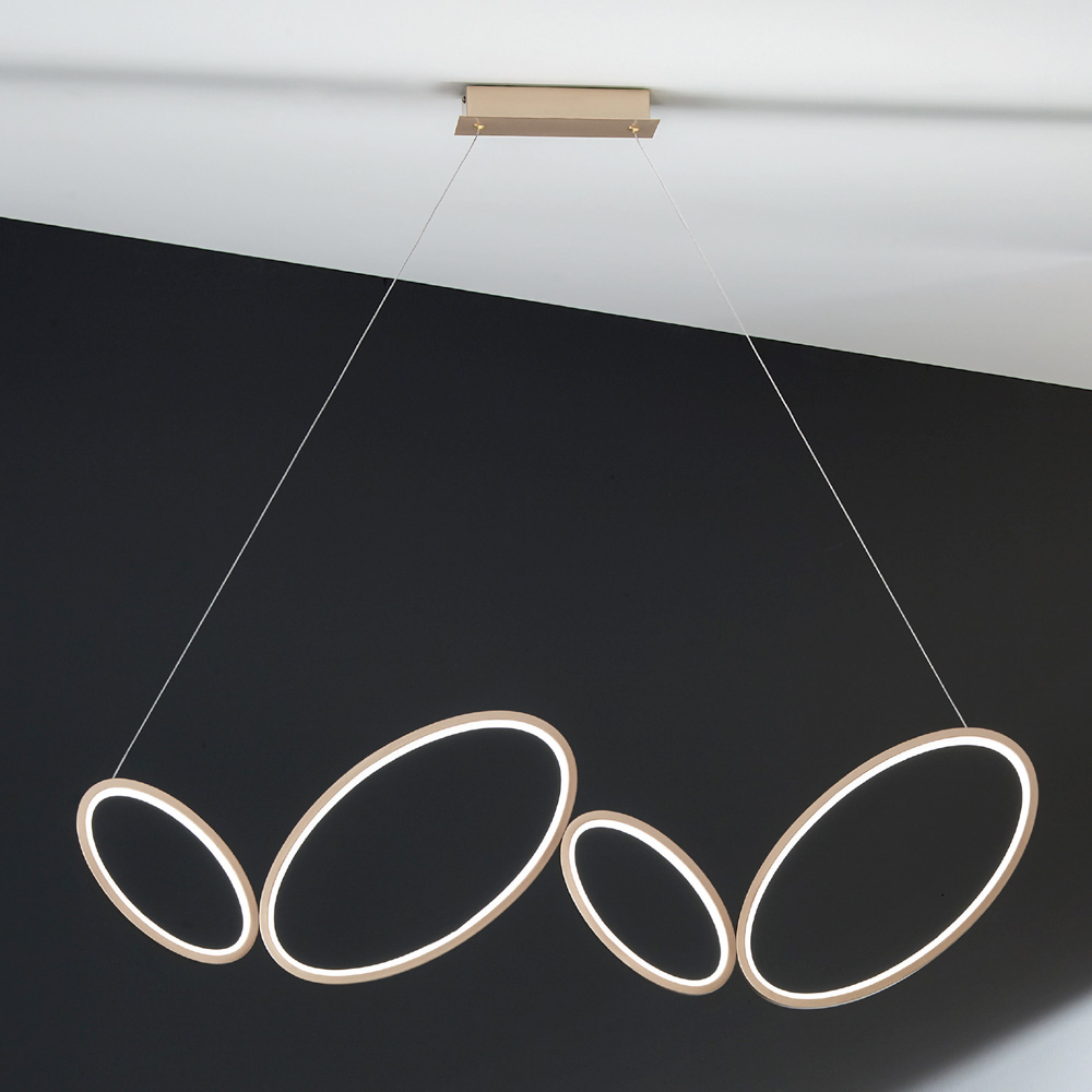 Suspended lamp with gold finish metal structure and acrylic and silicone diffuser complete with dimmable LED light source . A modern and exclusive aesthetic characterized by the use of oval shapes of different sizes to give life to a refined and innovative design capable of gaining the center of attention within domestic spaces such as dining rooms, kitchens, living rooms or bedrooms bed with contemporary furnishings. The wonderful golden finish that underlines the entire structure gives the product its personality, elegance and innovative character , thus creating a perfect solution for those who love furnishing their home through the use of objects with a unique style.