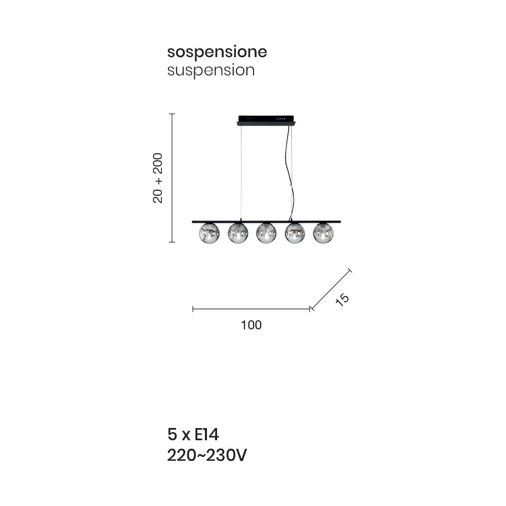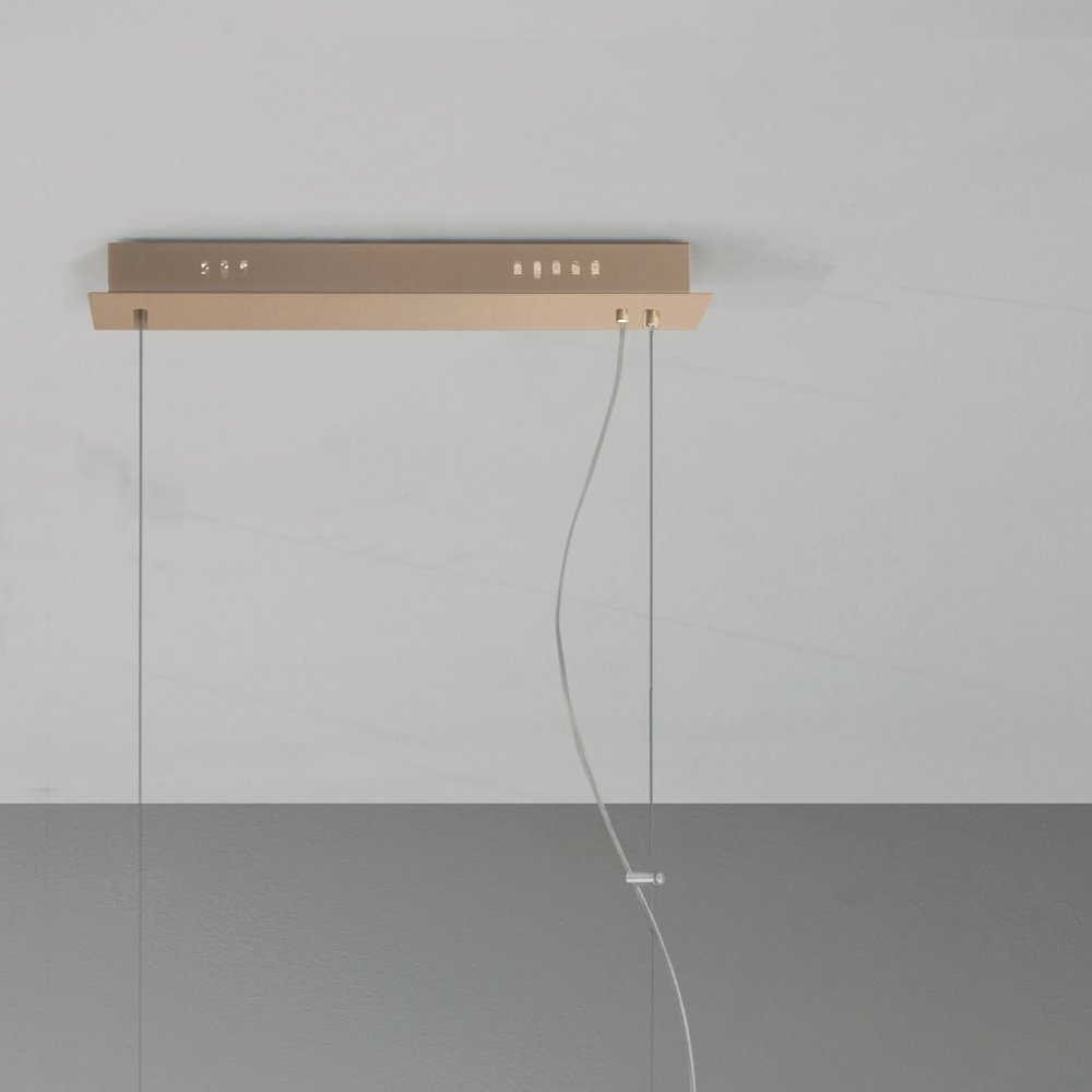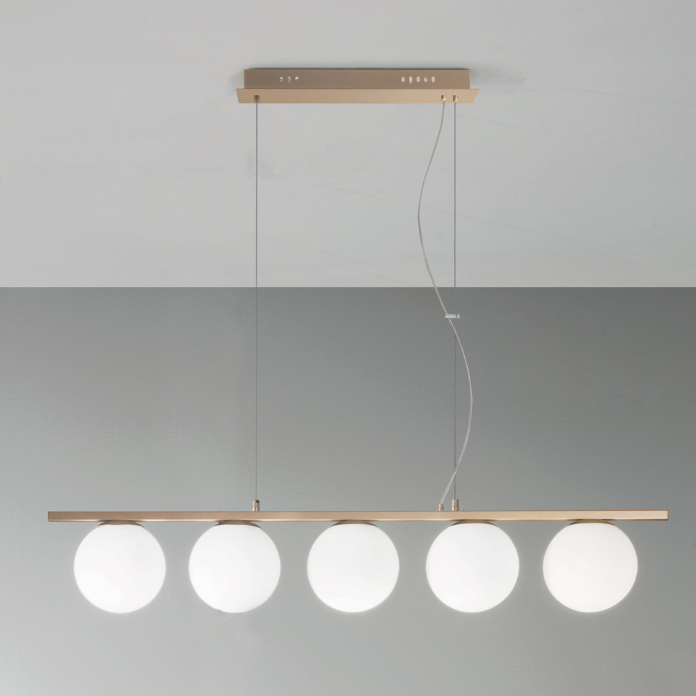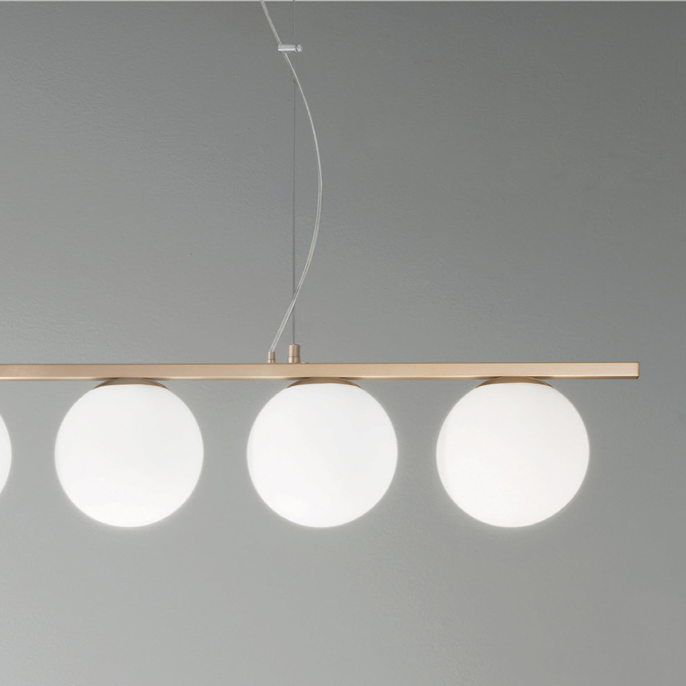 Suspension lamp with gold finish metal structure and spherical blown glass diffusers complete with height-adjustable cables. From the perfect combination of the modern touch of metal and the timeless elegance of blown glass comes an original and refined furnishing solution capable of gaining the center of attention within domestic environments with a contemporary taste. Its structure develops on a single line which makes it a particularly suitable solution for illuminating your table in the dining room or kitchen.