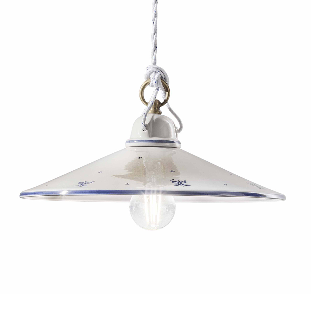 The pendant lamp is entirely made of iron and ceramic with hand-painted blue thread decorations   which highlight the skill and manual skills of the craftsmen.
