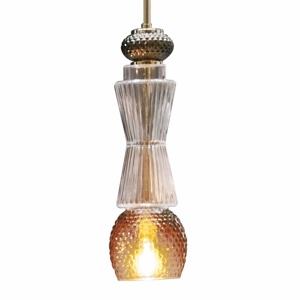 Suspended lamp in Murano glass with golden details and fabric cable, Made in Italy.