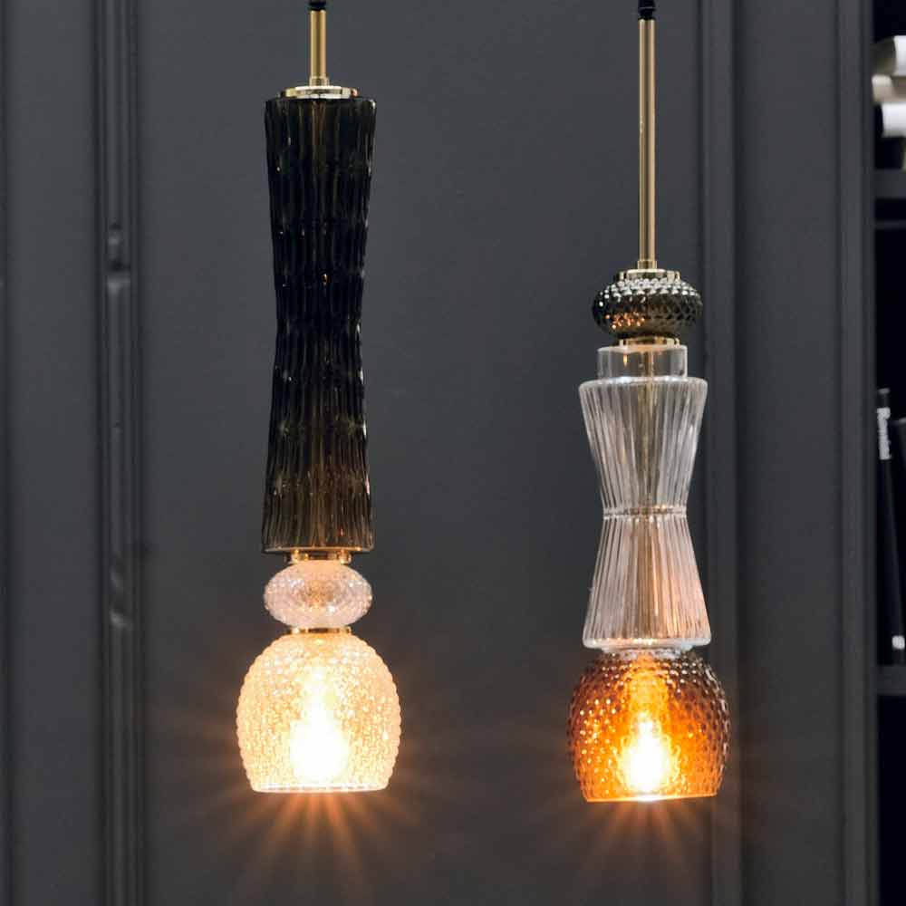 Suspension lamp inMurano glass with antique decoration, details in gold and anthracite fabric cable , made in Italy. The meeting between the timeless elegance of Murano glass and the refined touch of the golden elements bring to life a particularly innovative furnishing solution as it is capable of bringing together modernity and tradition for an exclusive and avant-garde result that succeeds to complete both modern and classic spaces with personality. Thanks to the choice of playing on geometric shapes and different finishes, what is born is an idea of lighting with a dynamic effect that creates a warm and welcoming atmosphere while enriching the aesthetics of the room.