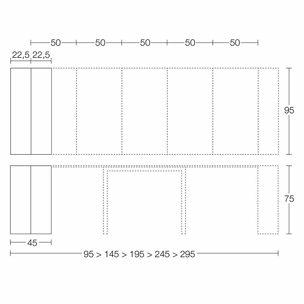 - Console: L 95 x D 45 x H 75 cm; Table: L 95/145/195/245/295 x D 95 x H 75 cm