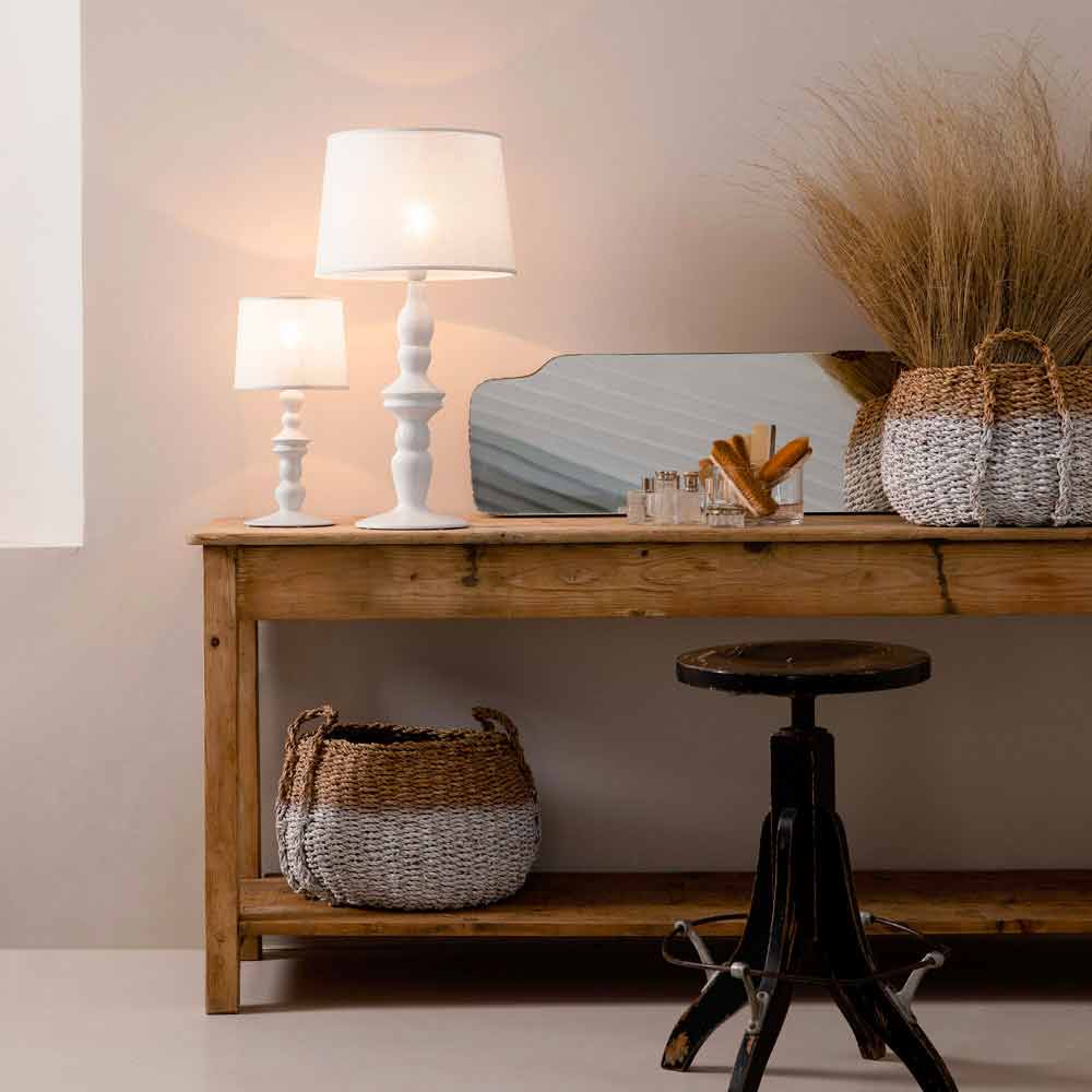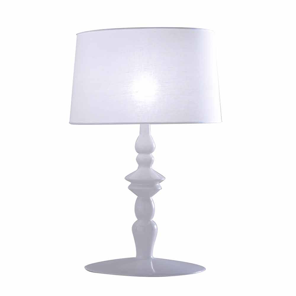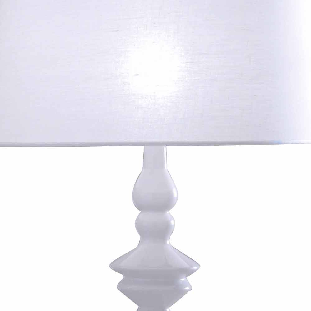 The lamp is made of glossy white ceramic as a material that represents the origin, the malleability, the creation and that leads directly to the origins of our culture. Lampshade in white linen.