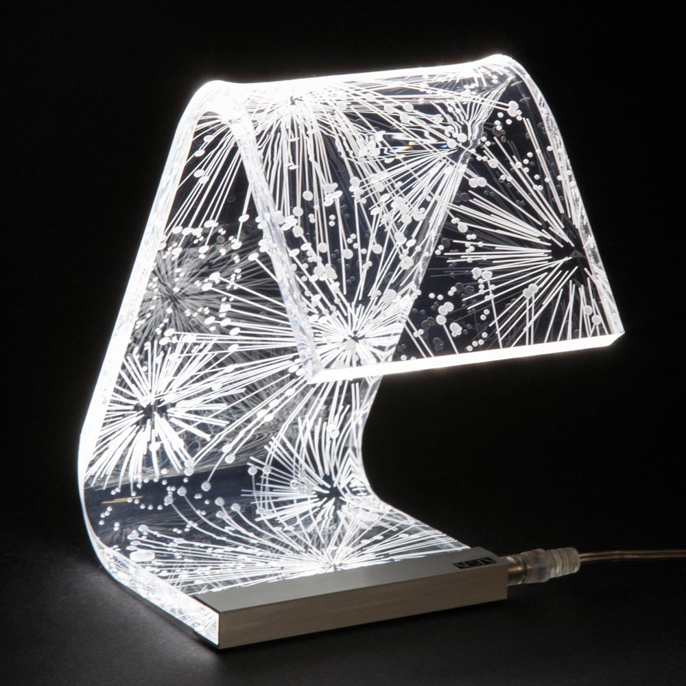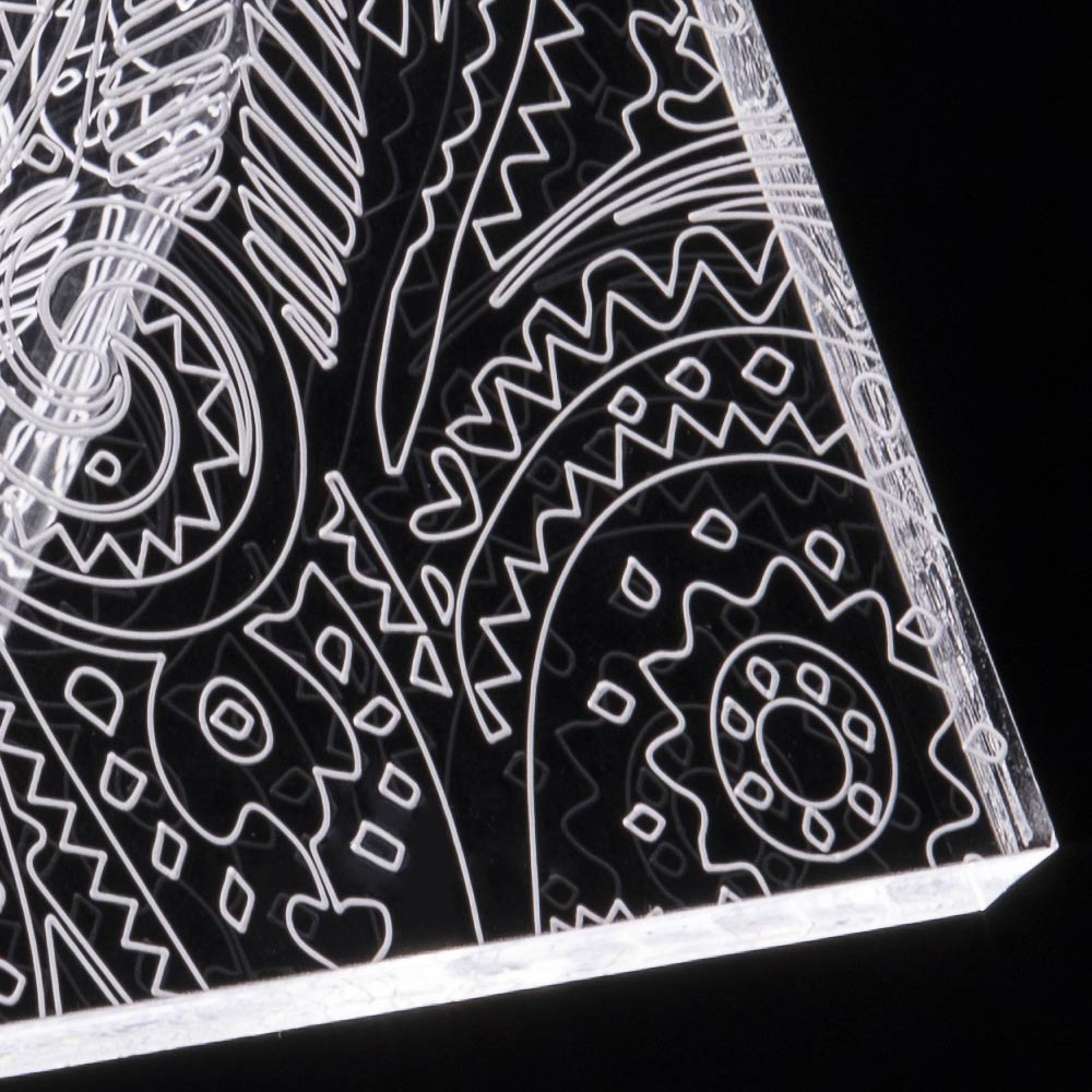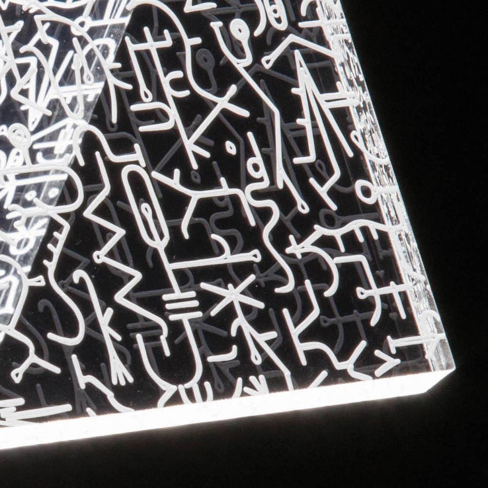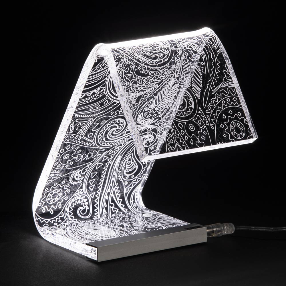 Table lamp in transparent acrylic crystal with laser decorations, 2 sizes made in Italy.