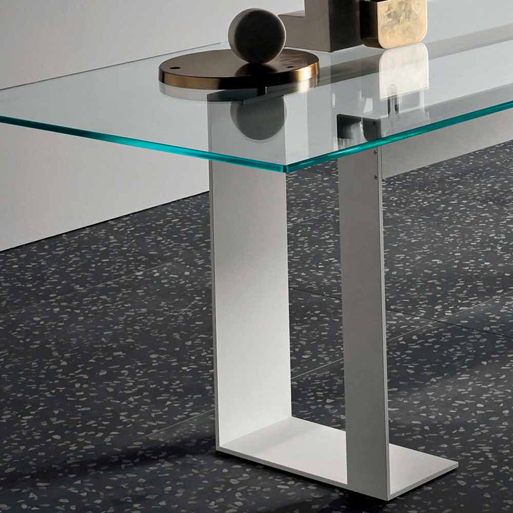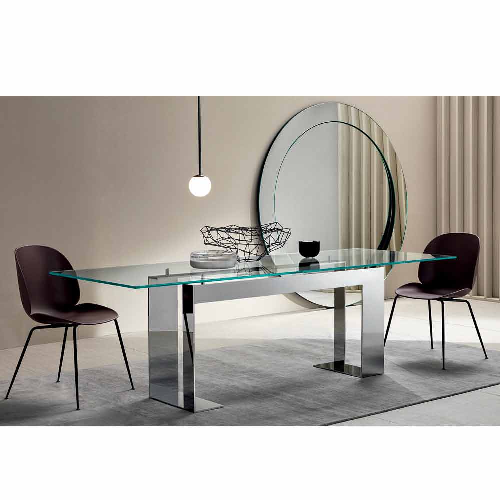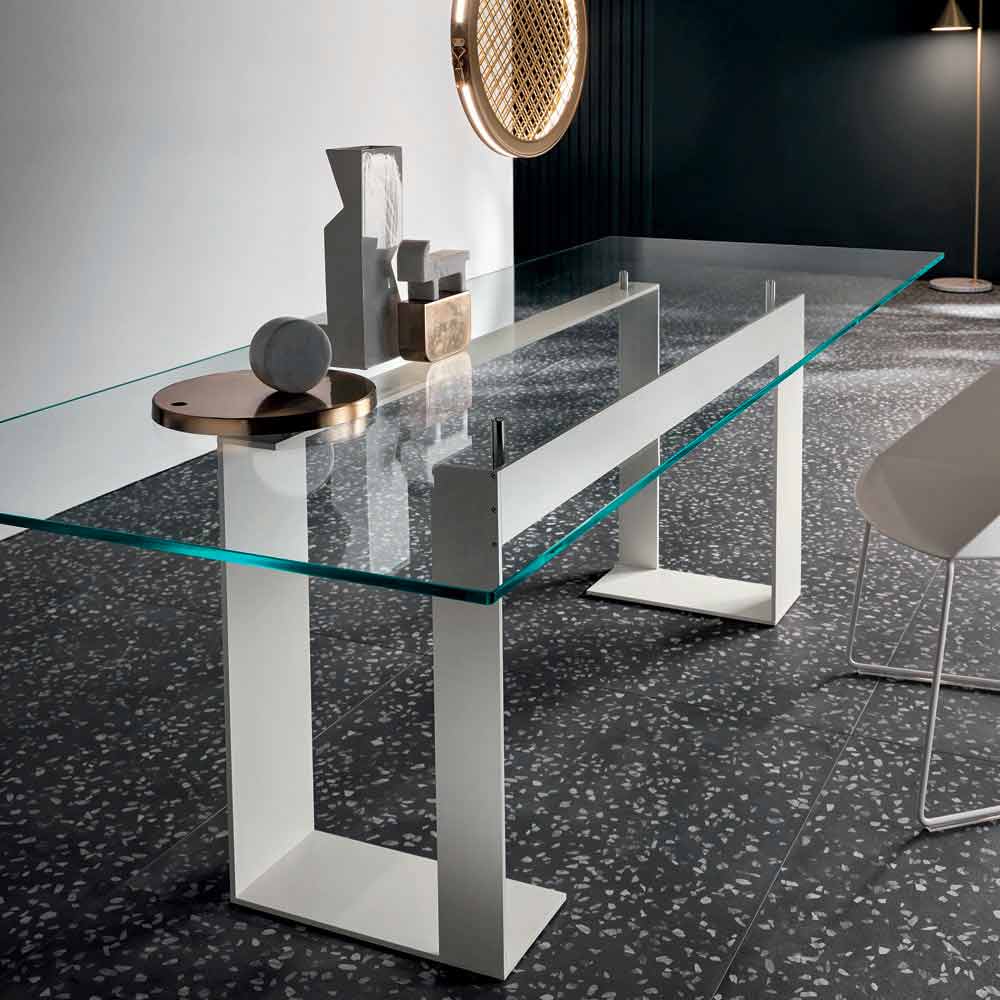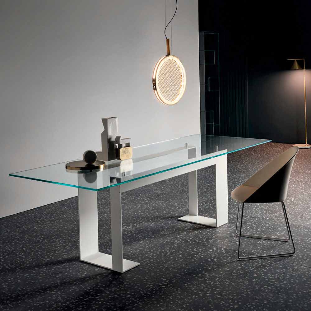 This dining table has an extra-clear tempered glass top that rests on 4 supports that lift it from the metal structure available in 3 finishes and 4 different sizes.