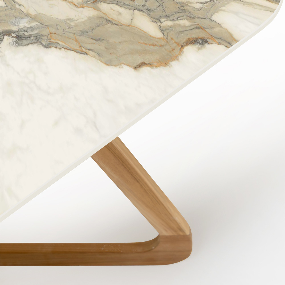 Outdoor table made with a base in solid natural teak wood (35 mm thick), top in infinity stoneware ceramic (12 mm thick) with a matt Calacatta Hermitage finish and a subframe in Okumé marine plywood , entirely Made in Italy.